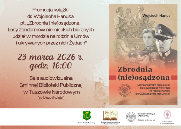 23/03/2026Promocja książkiPrezentacja książki „Zbrodnia (nie)osądzona. Losy żandarmów niemieckich biorących udział w mordzie na rodzinie Ulmów i ukrywanych przez nich Żydach” – Tuszów Narodowy, 23 marca 2026