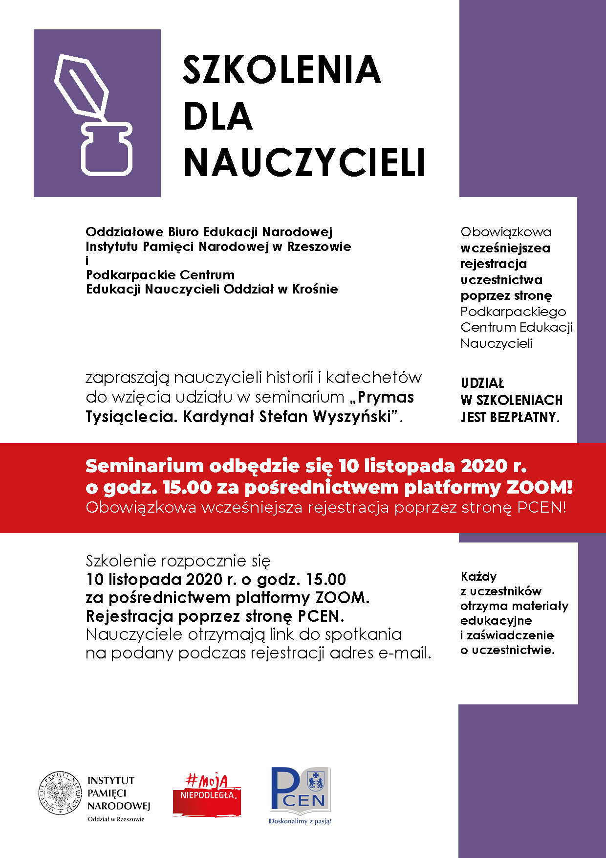 Warsztaty „Prymas Tysiąclecia. Kardynał Stefan Wyszyński”, które miały odbyć się 20 października 2020 r. o godz. 14.30 w Podkarpackim Centrum Edukacji Nauczycieli Oddział w Krośnie zostaną zorganizowane w formacie online w dniu 10 listopada 2020 r. o godz. 15.00 za pośrednictwem platformy ZOOM. Rejestracja poprzez stronę PCEN.