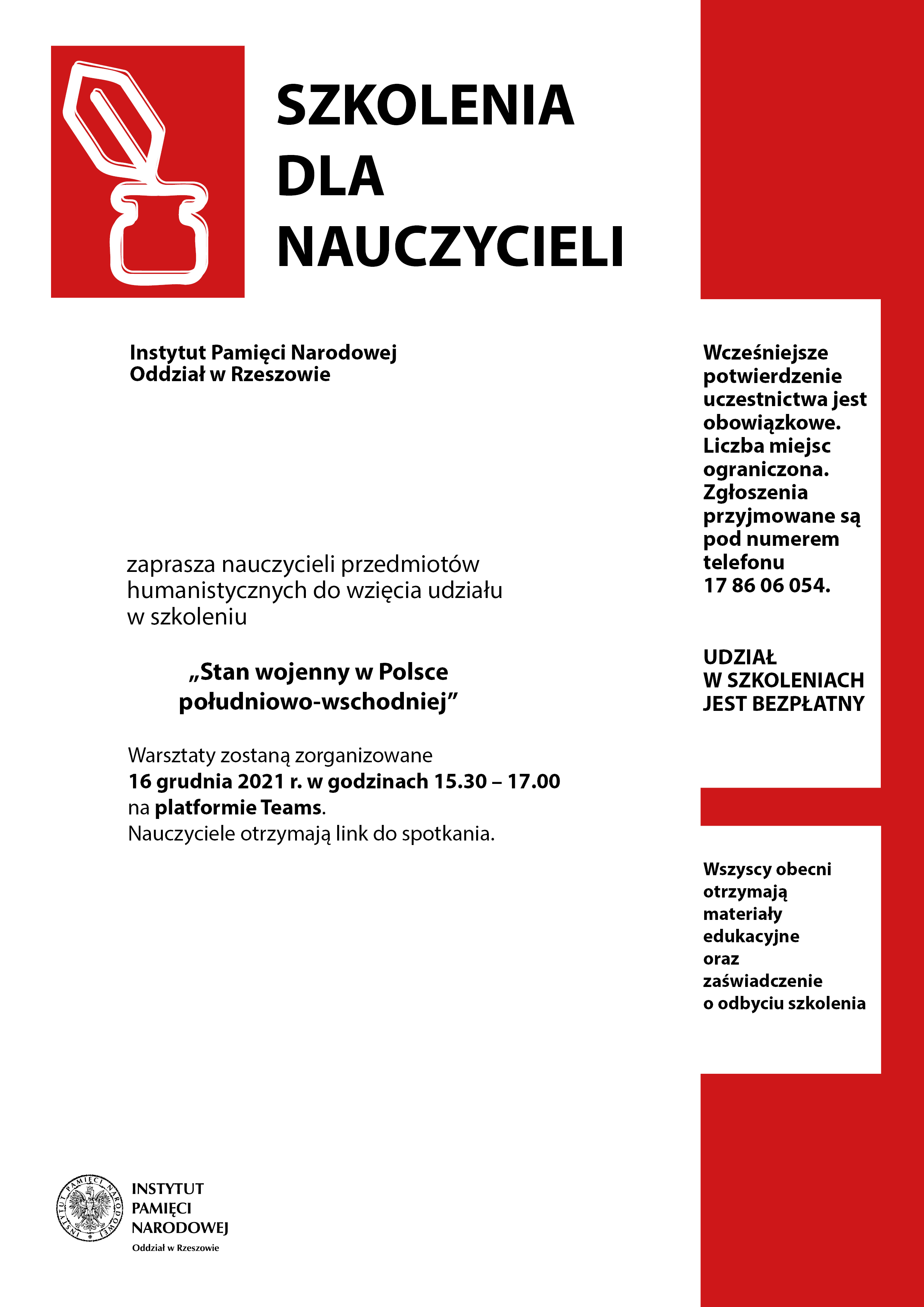 Instytut Pamięci Narodowej Oddzial w Rzeszowie zaprasza nauczycieli przedmiotów humanistycznych do wziecia udzialu w szkoleniu „Stan wojenny w Polsce południowo-wschodniej”.