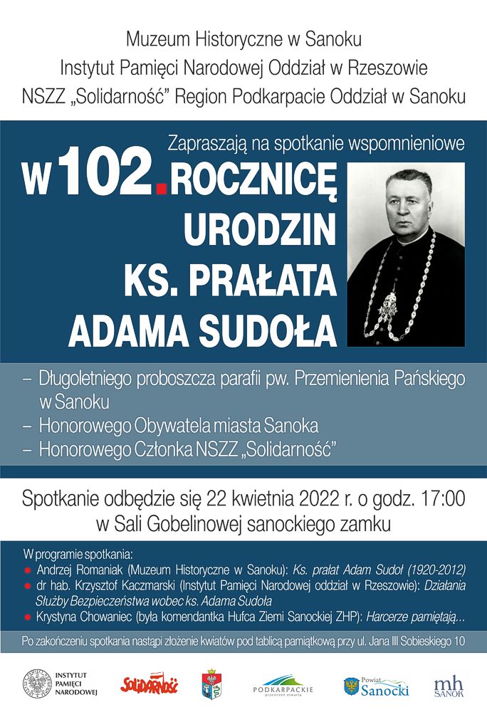 Muzeum Historyczne w Sanoku, Instytut Pamięci Narodowej Oddział w Rzeszowie, NSZZ „Solidarność” Region Podkarpacie Oddział w Sanoku zapraszają na „Spotkanie wspomnieniowe w 102. rocznicę urodzin ks. prałata Adama Sudoła”, długoletniego proboszcza parafii pw. Przemienienia Pańskiego w Sanoku, Honorowego Obywatela Miasta Sanoka, Honorowego Członka NSZZ „Solidarność”.