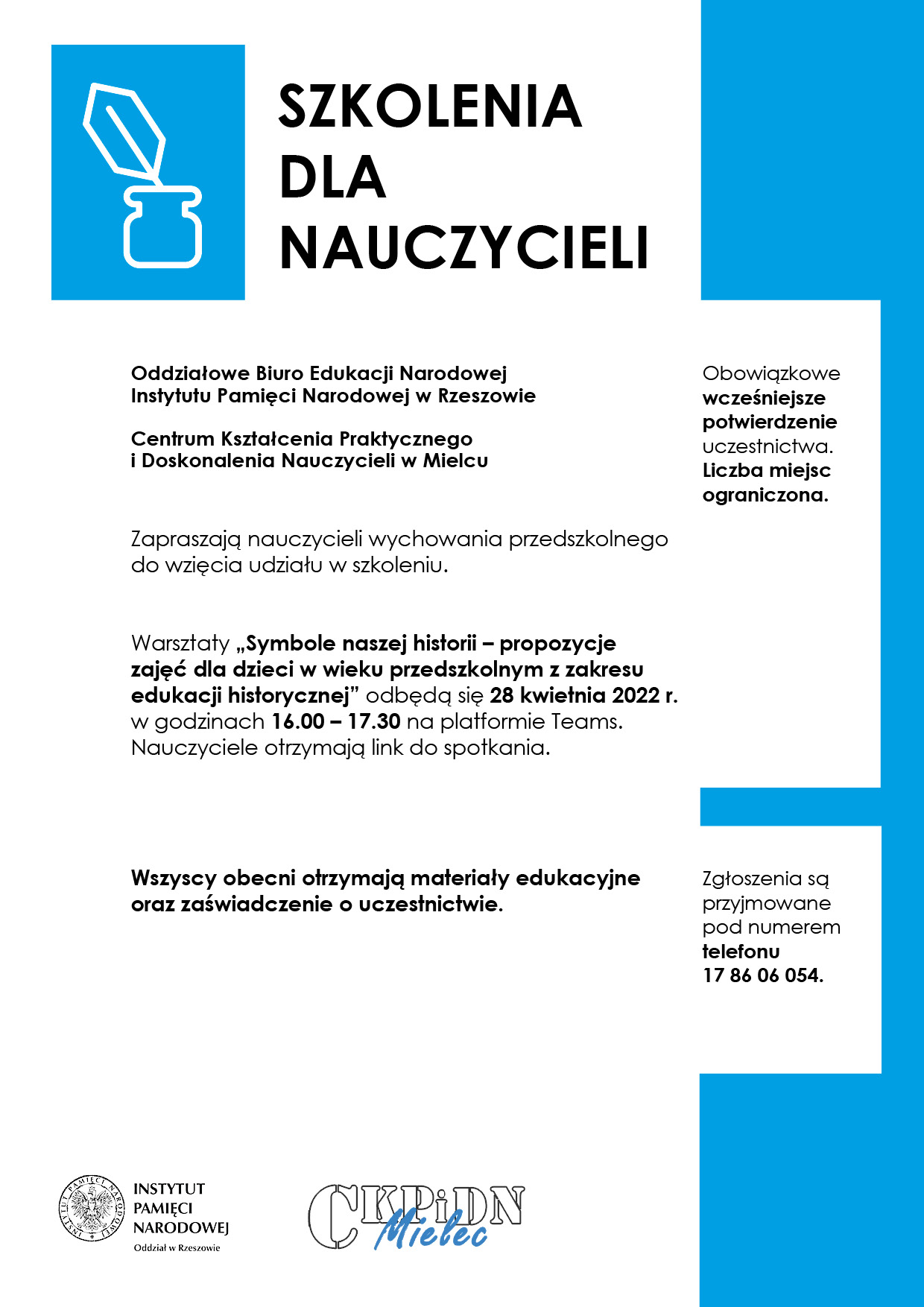 Oddziałowe Biuro Edukacji Narodowej Instytutu Pamięci Narodowej w Rzeszowie oraz Centrum Kształcenia Praktycznego i Doskonalenia Nauczycieli w Mielcu zapraszają nauczycieli wychowania przedszkolnego do wzięcia udziału w szkoleniu.