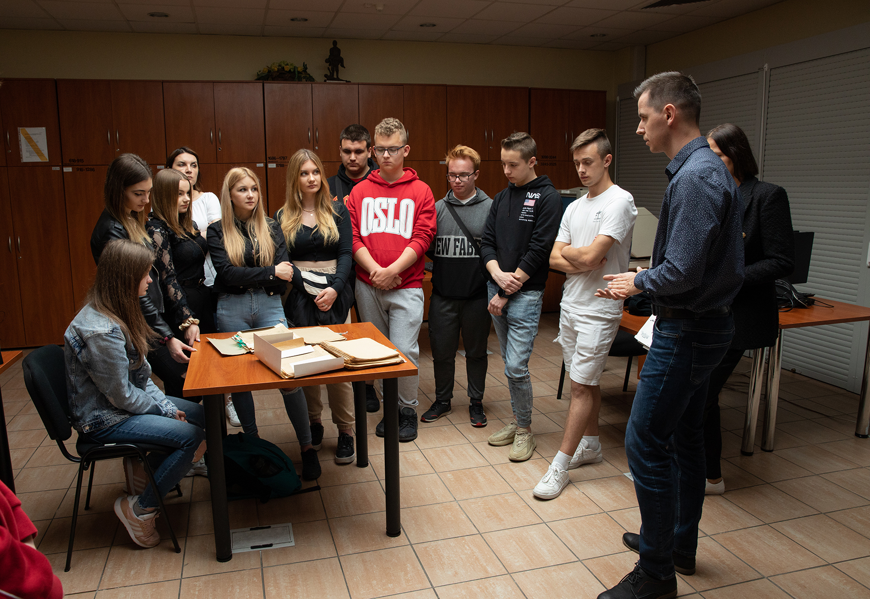 Młodzież miała również możliwość zwiedzenia magazynów archiwalnych. Joanna Kublicka przedstawiła specyfikę zgromadzonych archiwaliów, sposób i warunki przechowywania, zabezpieczania i konserwacji dokumentów w pracowni reparacji.