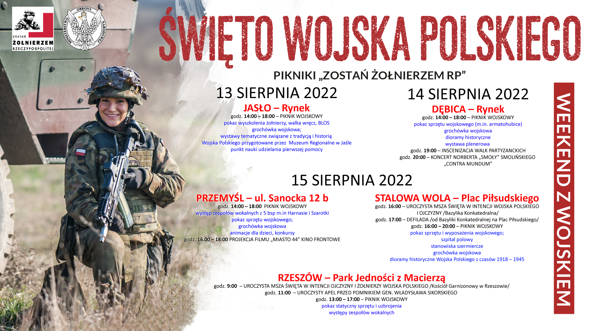 W dniach 13-15 sierpnia na terenie Podkarpacia Wojsko Polskie zorganizowało pikniki pod hasłem ”Weekend z wojskiem”. Wydarzenia to odbyły się  w Jaśle, Dębicy, Przemyślu, Stalowej Woli i Rzeszowie. Oprócz pokazu sprzętu wojskowego, animacji dla dzieci, konkursów z nagrodami, wystaw plenerowych,  degustacji wojskowej grochówki w trakcie trwania pikników działały punkty rekrutacyjne, w których można było uzyskać informacje o nowym rodzaju służby - dobrowolnej zasadniczej służbie wojskowej.