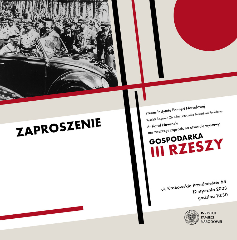 W czwartek 12 stycznia 2023 roku o godz. 10.30 przed Domem Polonii w Warszawie (ul. Krakowskie Przedmieście 64) odbędzie się uroczyste otwarcie wystawy plenerowej IPN „Gospodarka III Rzeszy” z udziałem prezesa IPN dr. Karola Nawrockiego.