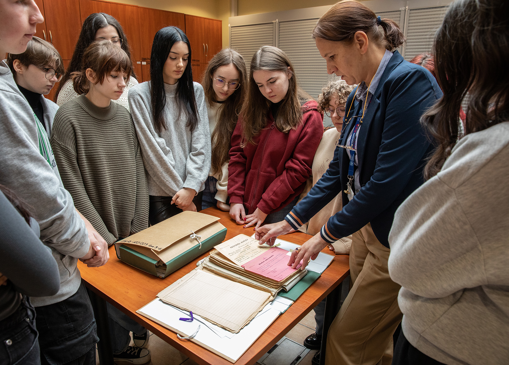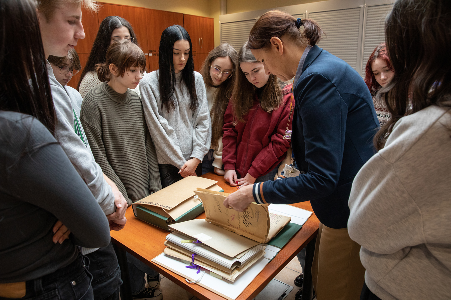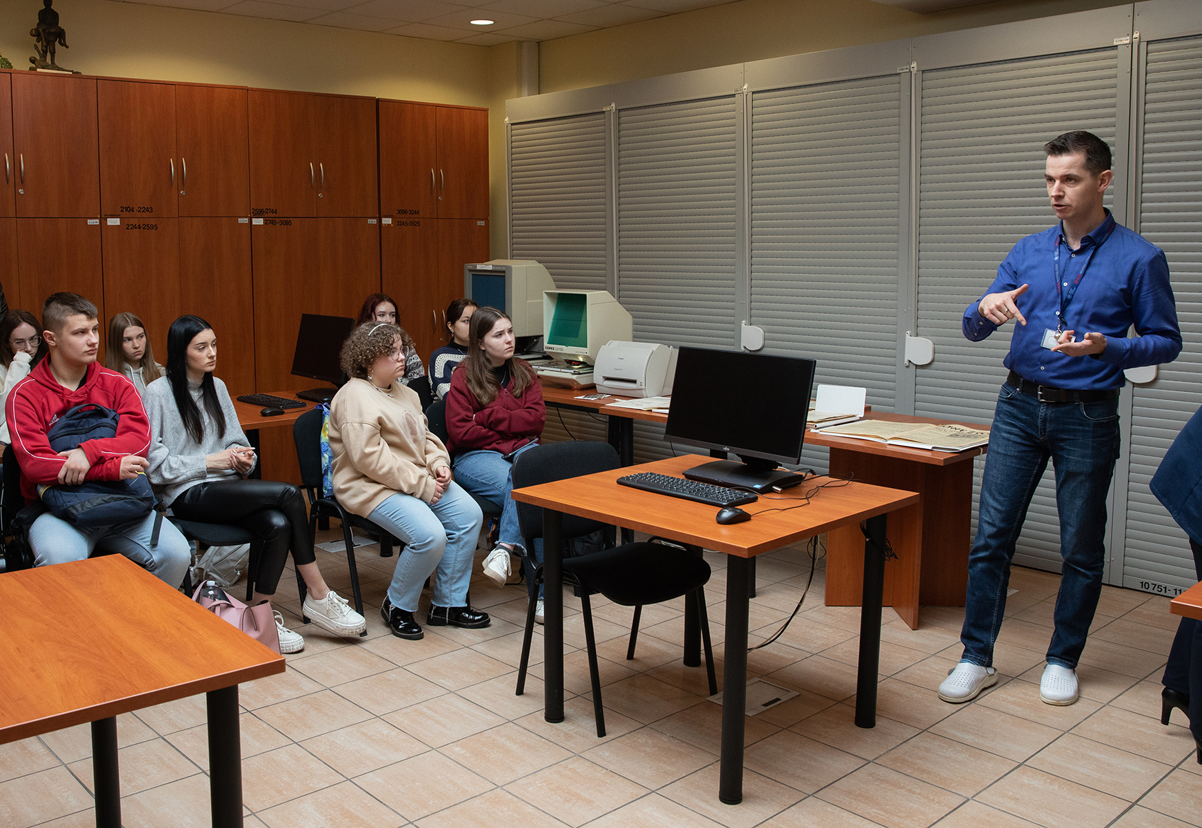 Młodzież miała również możliwość zwiedzenia magazynów archiwalnych. Joanna Kublicka kierownik Referatu GOiOM opowiedziała o warunkach przechowywania, zabezpieczania i konserwacji dokumentów oraz przygotowania oryginałów akt do udostępnienia w czytelni.