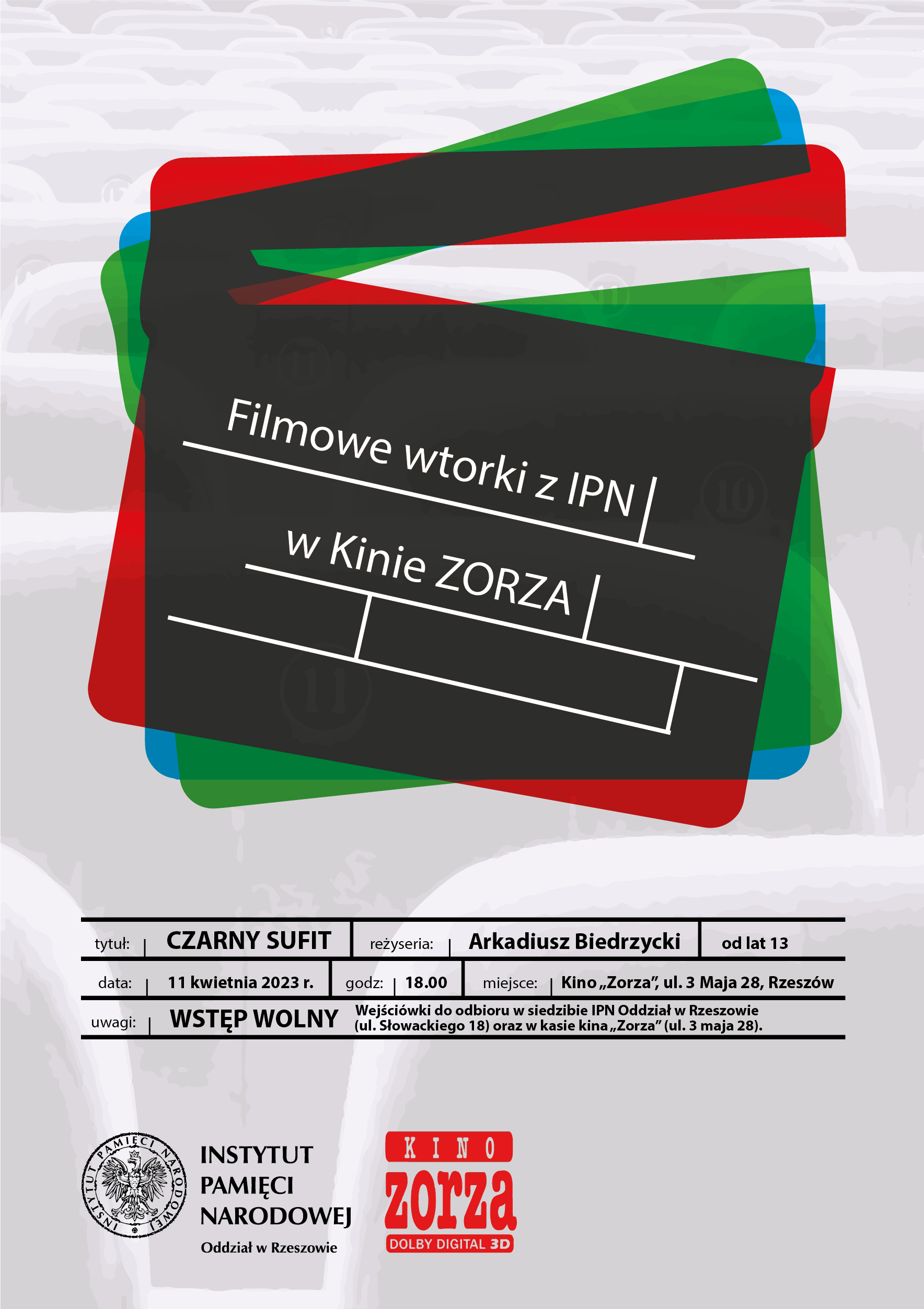 Dostępność biletów do sprawdzenia pod numerem telefonu 17 86 06 054. Odbiór wejściówek od piątku 31 marca w siedzibie IPN przy ul. Słowackiego 18 oraz w Kinie „Zorza”.