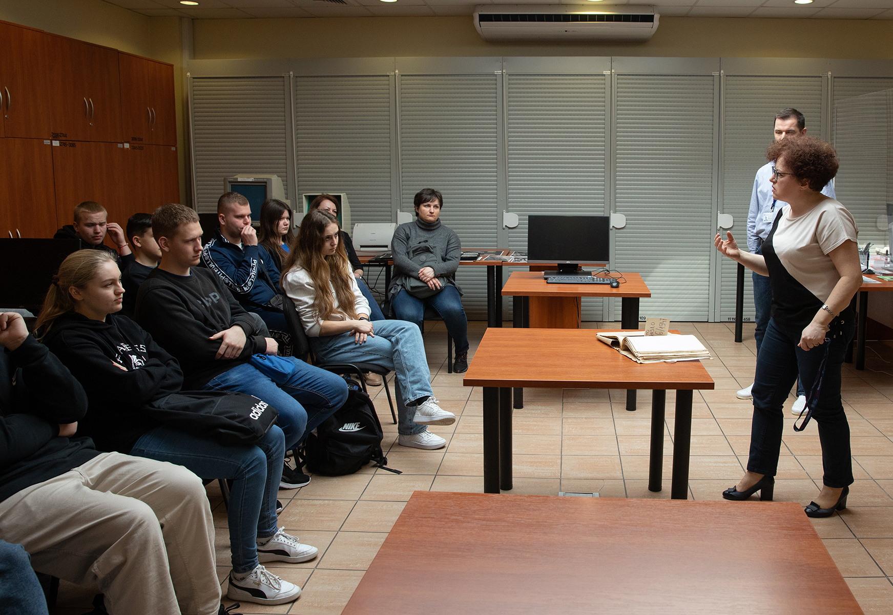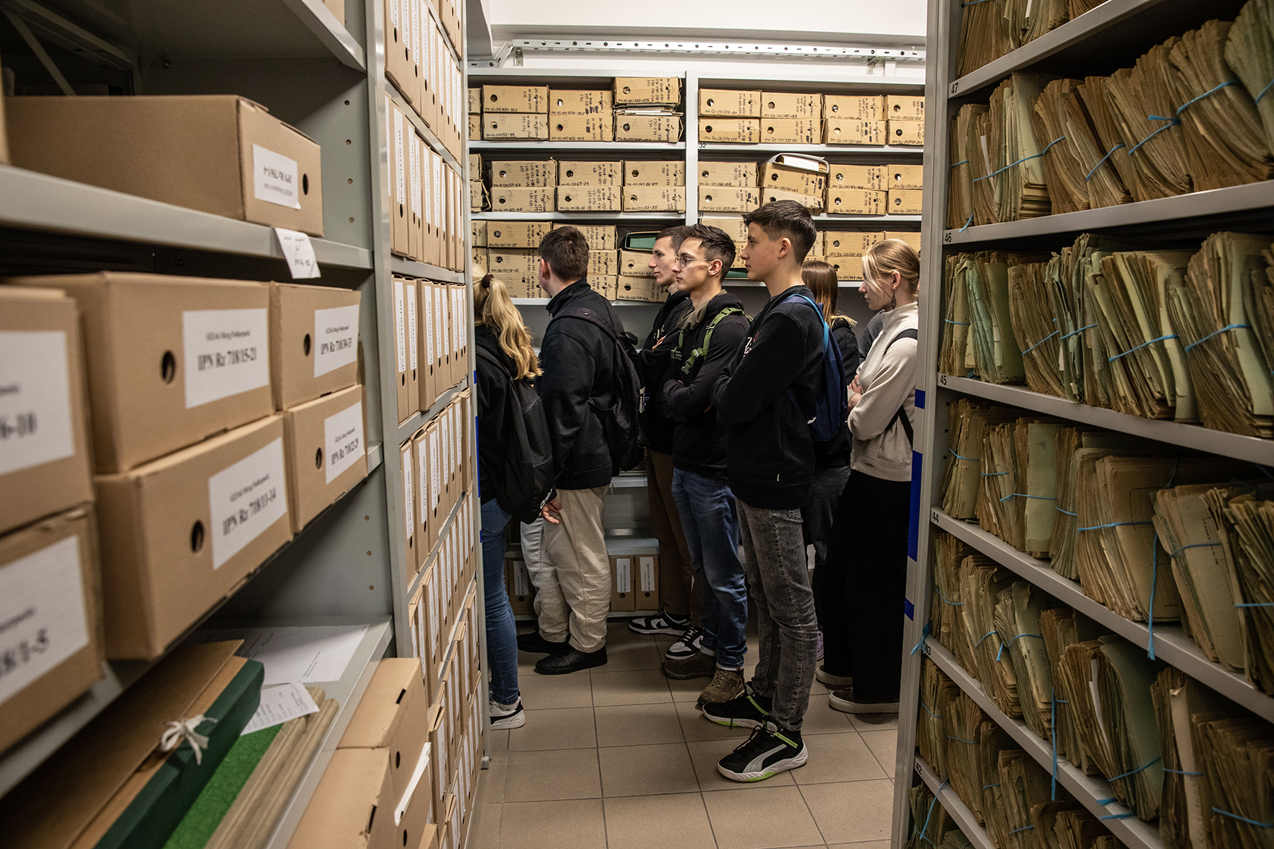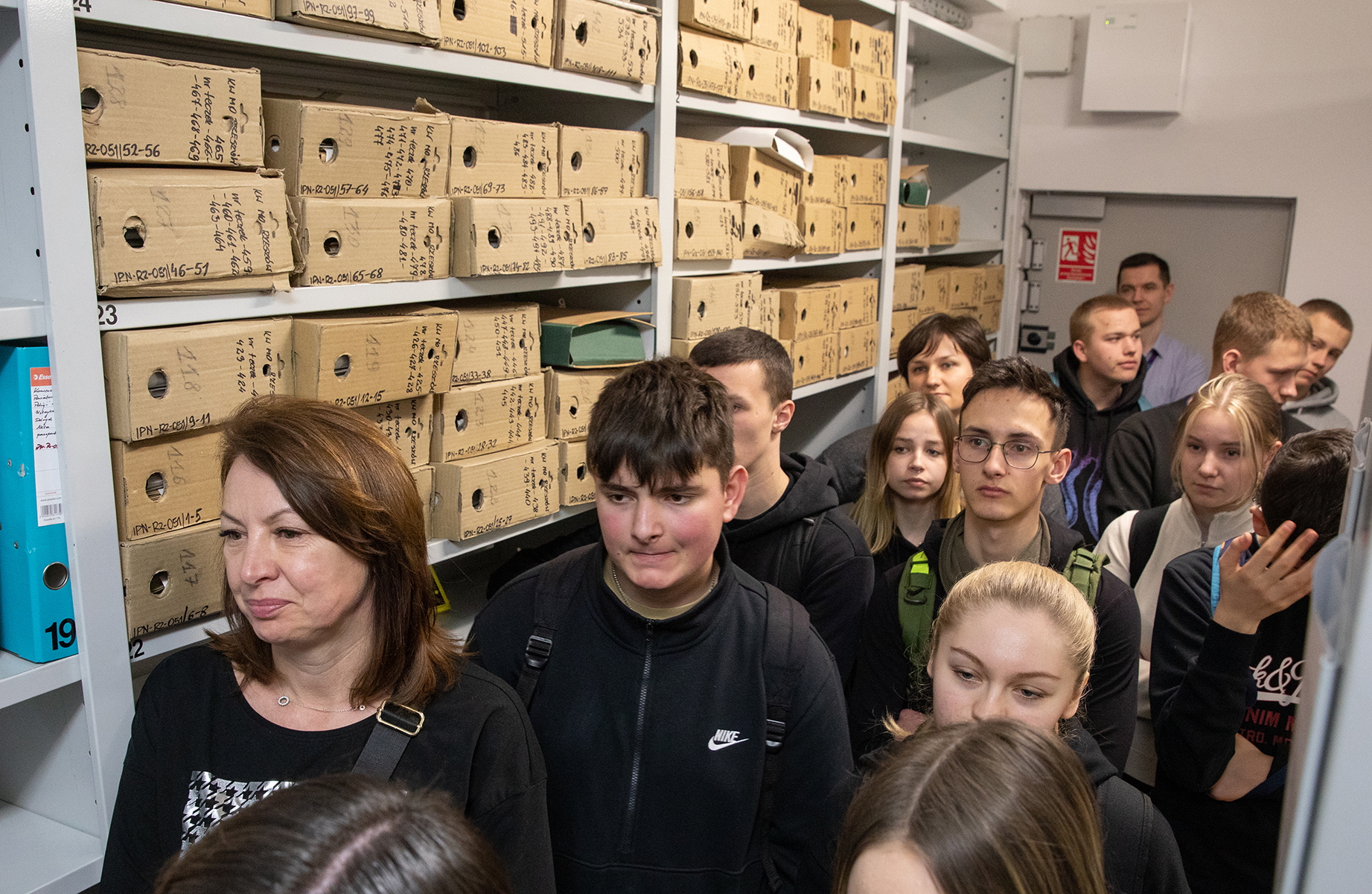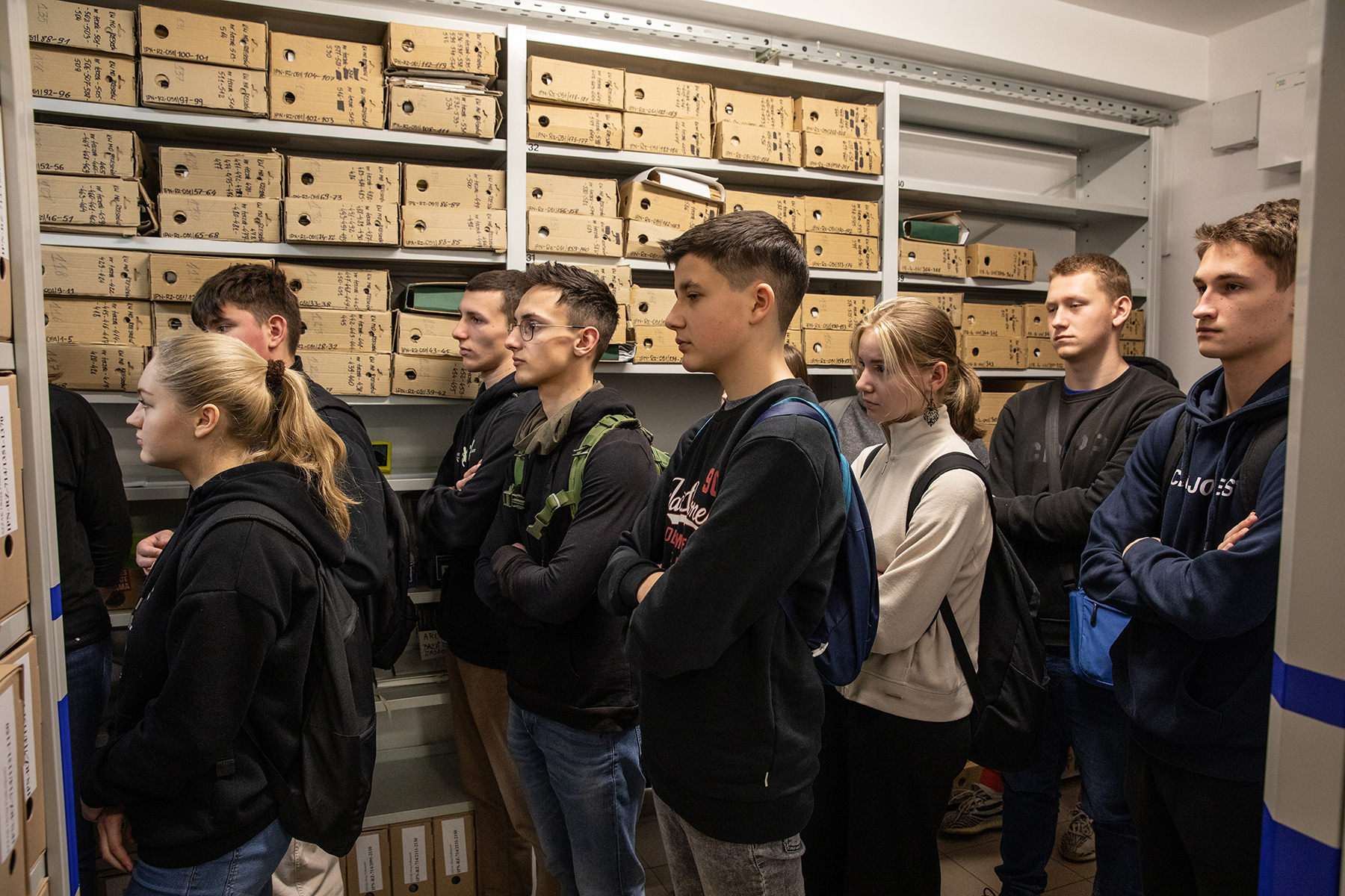Młodzież miała również możliwość zwiedzenia magazynów archiwalnych. Joanna Kublicka kierownik Referatu Gromadzenia, Opracowania i Obsługi Magazynów przedstawiła sposób i warunki przechowywania dokumentów. Zgromadzonym zaprezentowano magazyn, w którym są przechowywane akta paszportowe.