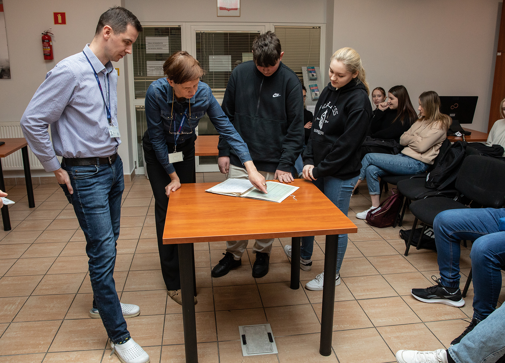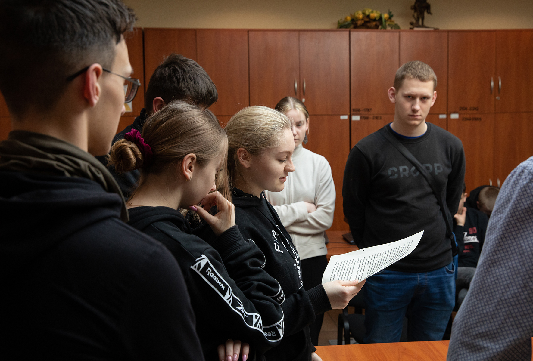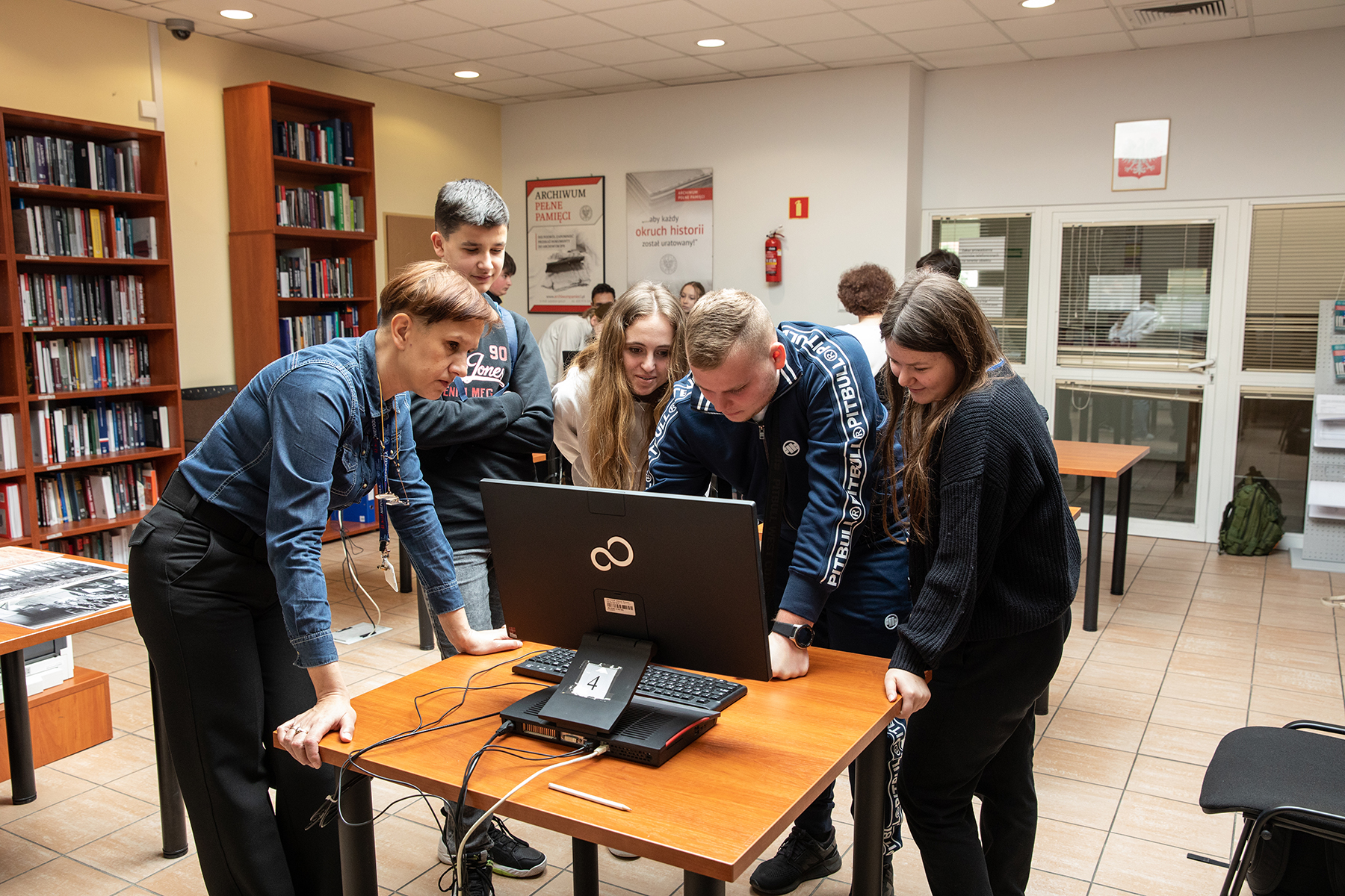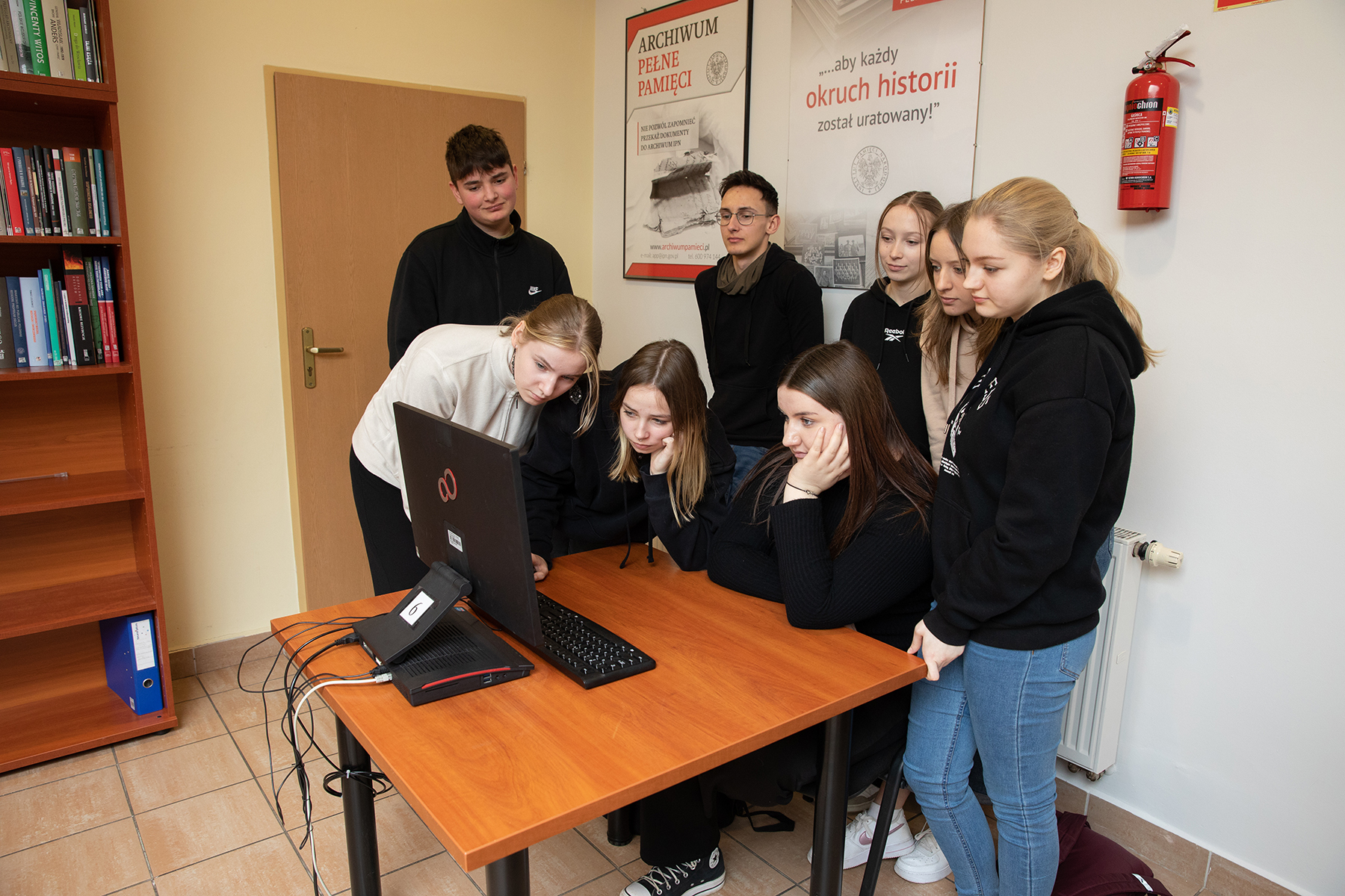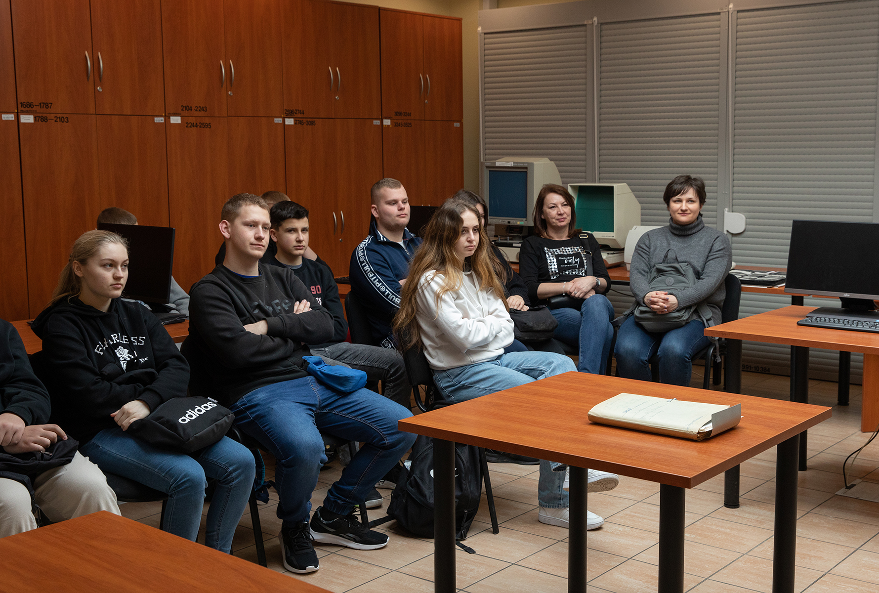 Młodzież miała również możliwość zwiedzenia magazynów archiwalnych. Joanna Kublicka kierownik Referatu Gromadzenia, Opracowania i Obsługi Magazynów przedstawiła sposób i warunki przechowywania dokumentów. Zgromadzonym zaprezentowano magazyn, w którym są przechowywane akta paszportowe.