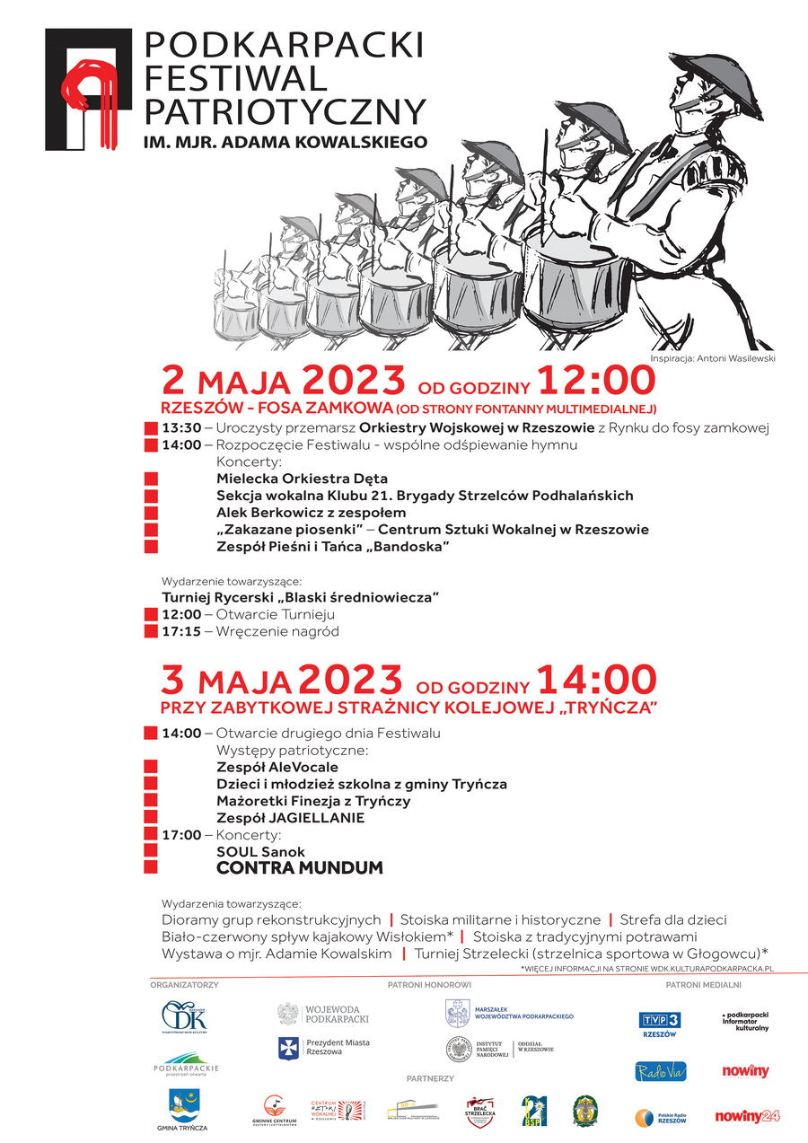 Podkarpacki Festiwal Patriotyczny im. mjr. Adama Kowalskiego 2023 to druga edycja artystyczno-historycznej formy świętowania Dnia Flagi Rzeczypospolitej oraz Święta Konstytucji Trzeciego Maja. Organizatorami wydarzenia jest Wojewódzki Dom Kultury w Rzeszowie, Województwo Podkarpackie i Gmina Tryńcza.