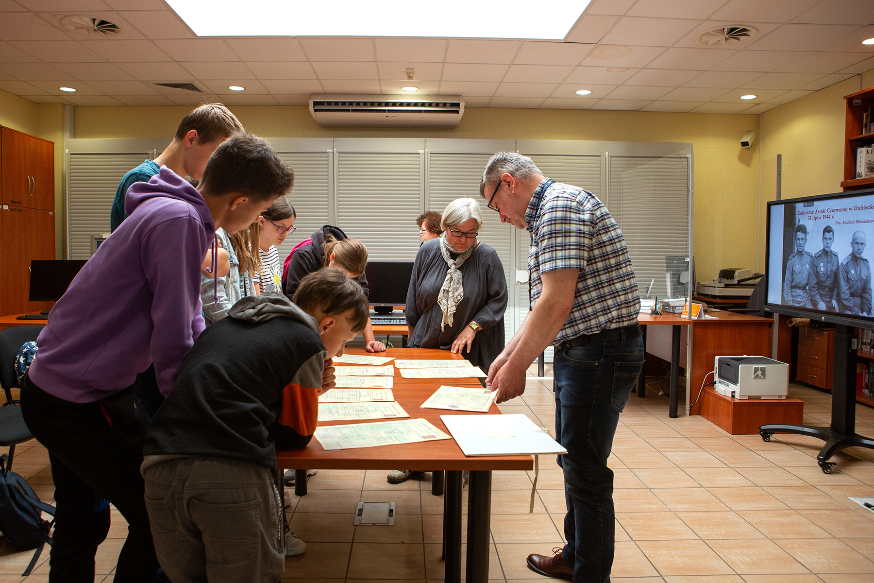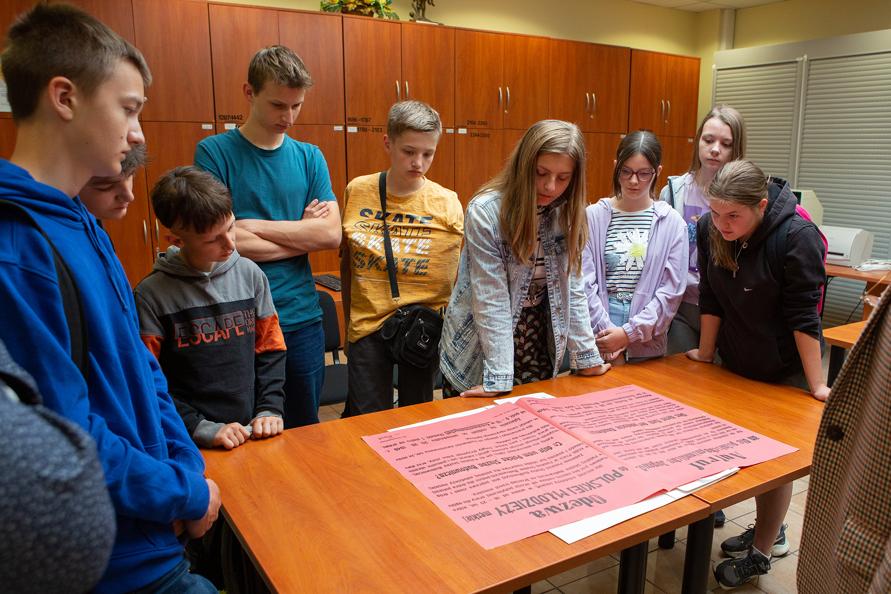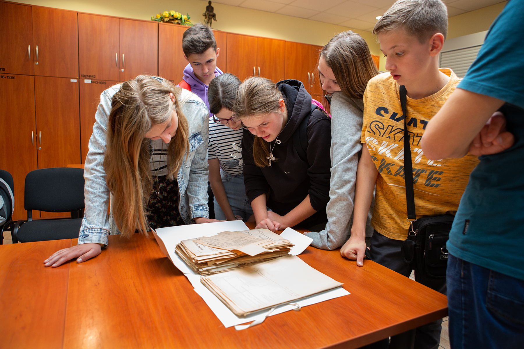 Zajęcia dla uczniów klasy VIII pod opieką Magdaleny Kowalskiej-Cheffey w Czytelni Akt Jawnych prowadzili Agnieszka Skrzypek, Ewa Pilch, Karol Krzyszczuk oraz Igor Witowicz pracownicy OAIPN. Uczniowie zapoznali się z działalnością IPN, z oryginalnymi dokumentami pochodzącymi z zasobu archiwalnego Oddziału IPN w Rzeszowie: m.in. oryginalne obwieszczenie władz niemieckich, ankiety, akta sądowe, sprawozdania MO, akta internowanego i akta paszportowe.