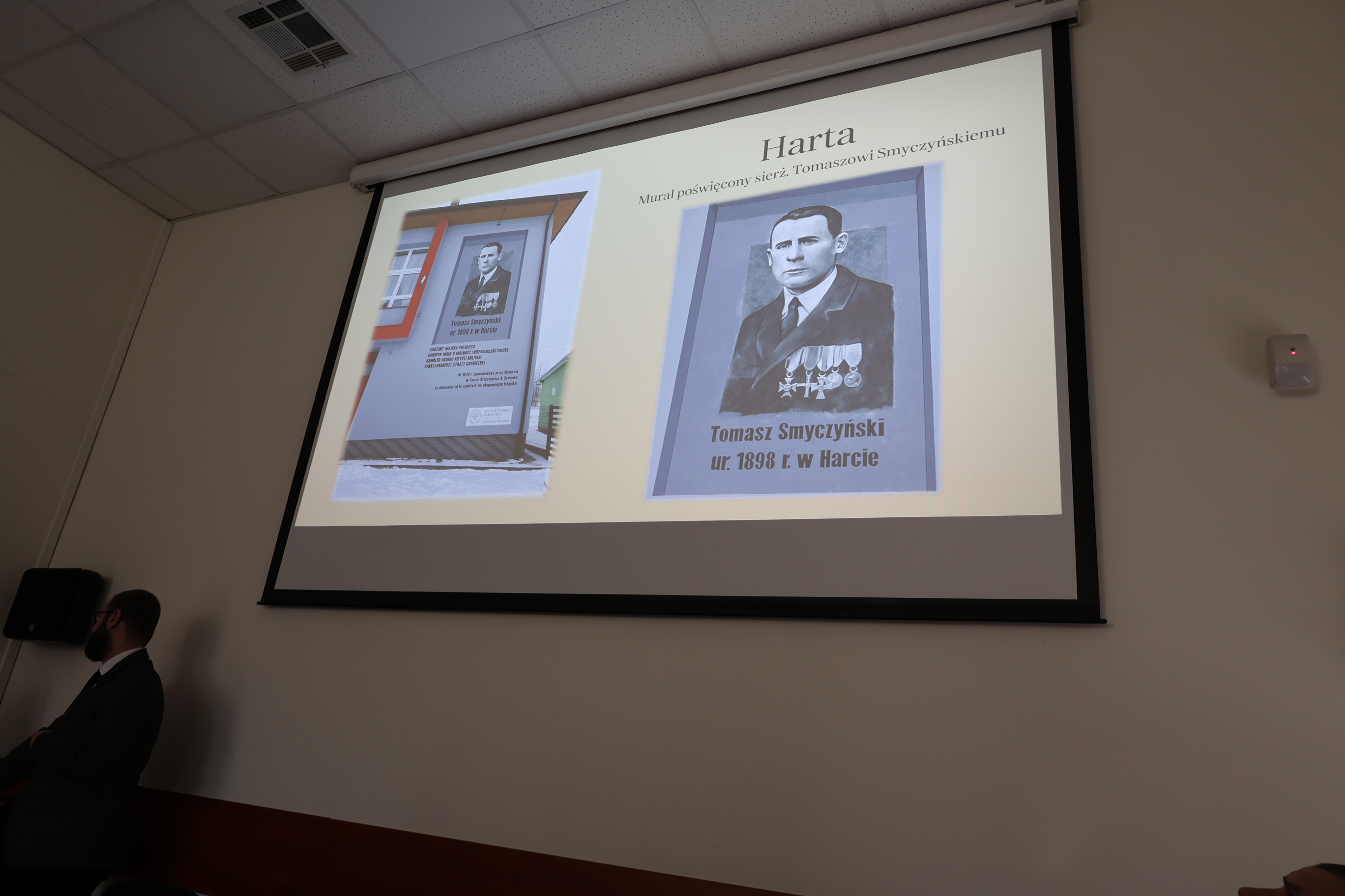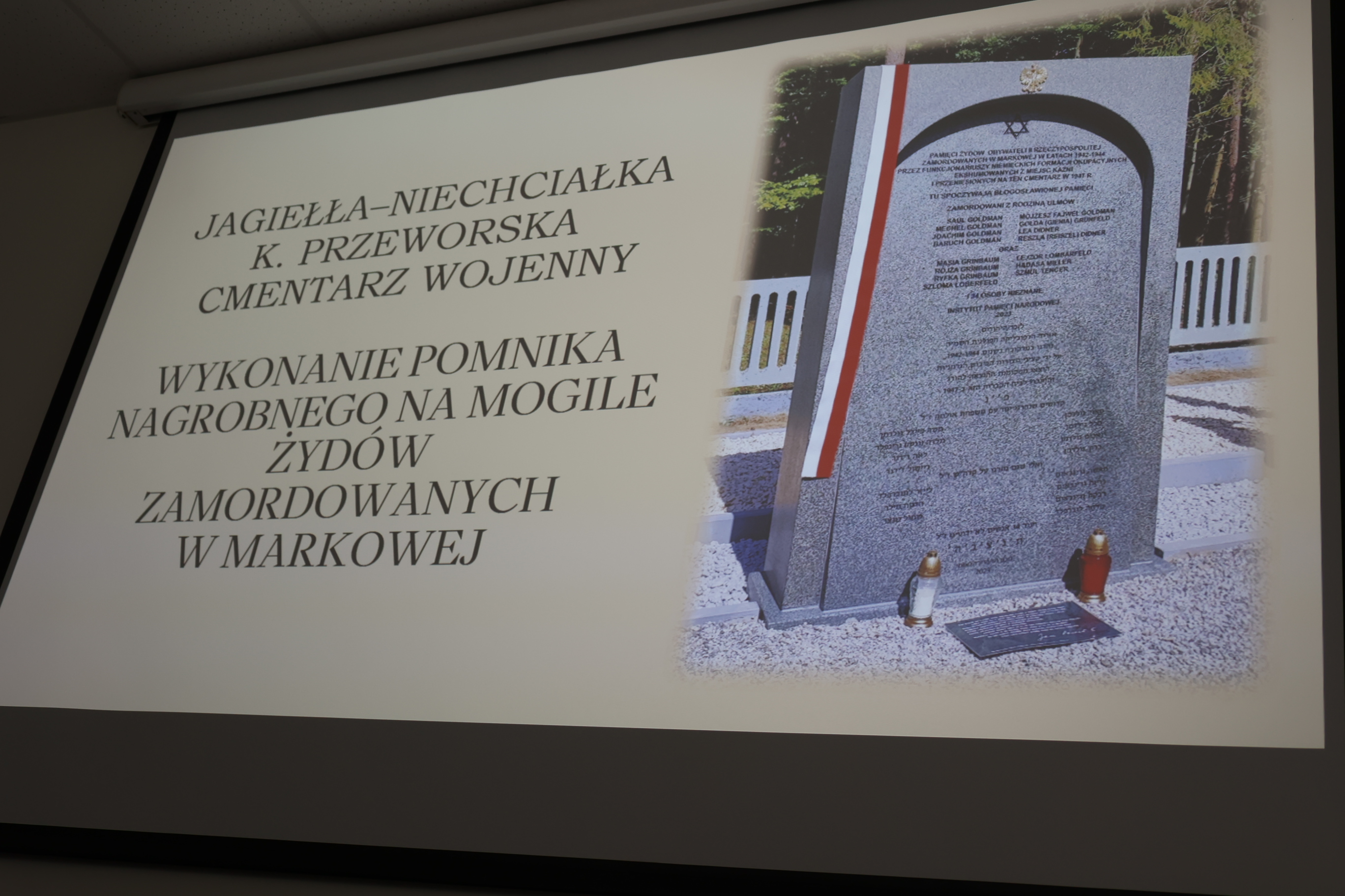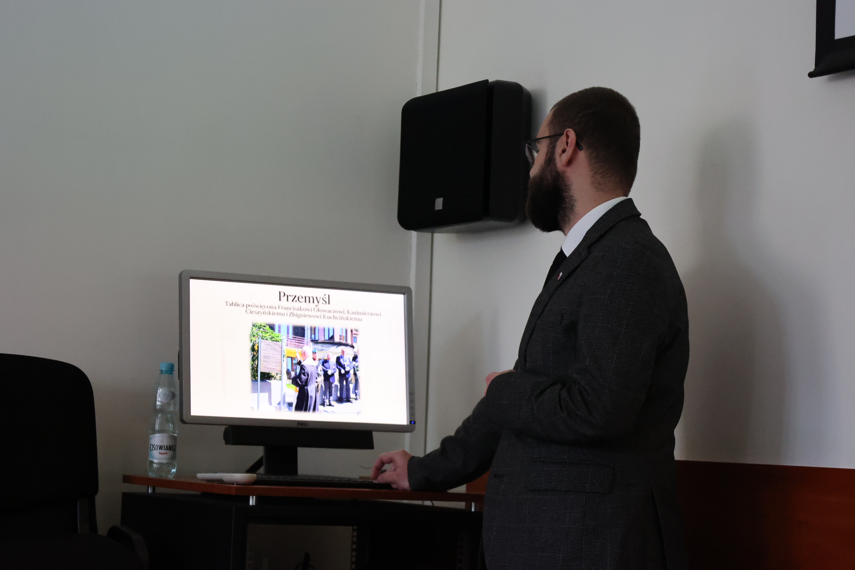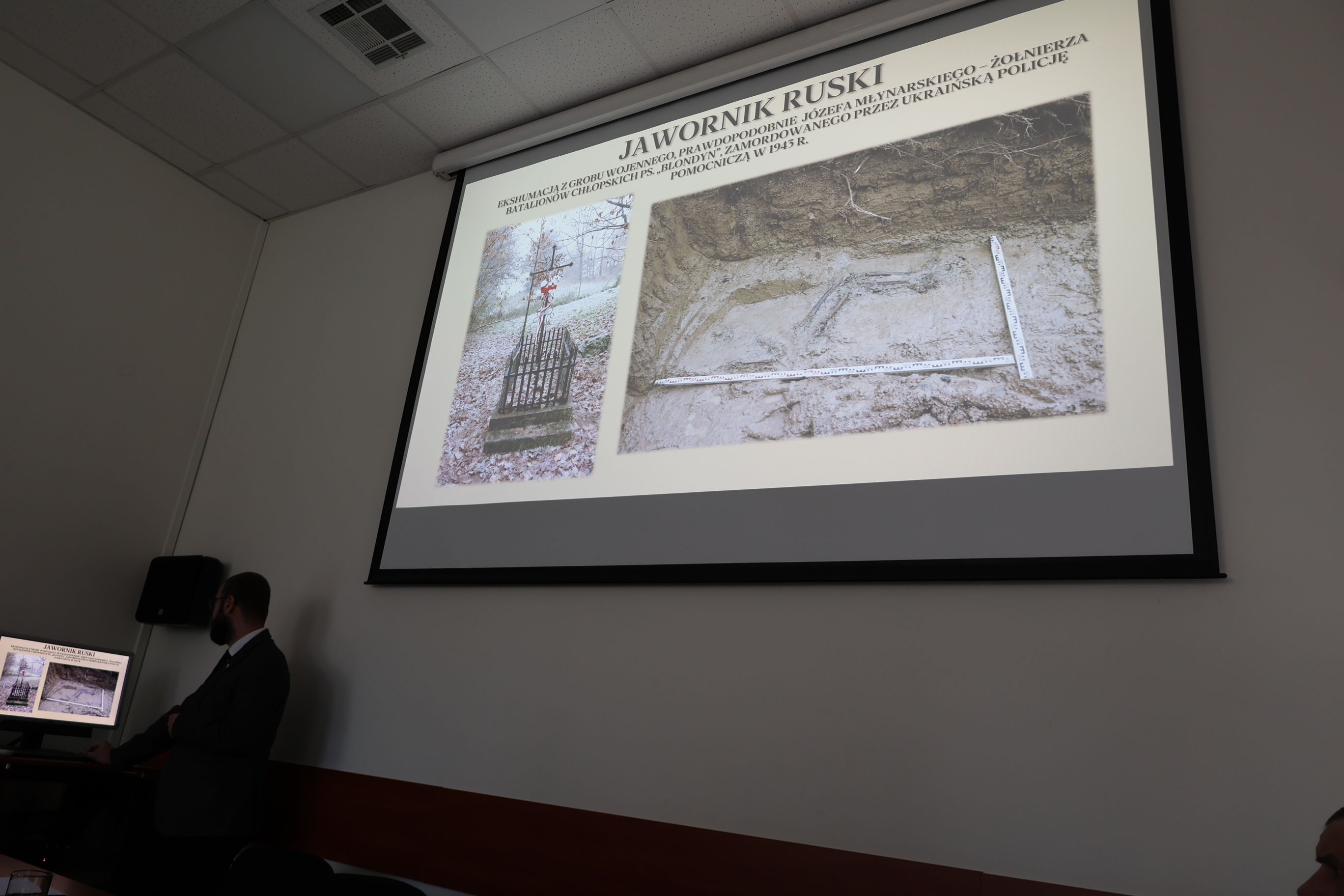 Następnie Grzegorz Leszczyński po. naczelnika Oddziałowego Biura Upamiętniania Walk i Męczeństwa IPN w Rzeszowie podsumował prace Oddziałowego Biura w 2023 r. oraz przedstawił prezentację zawierającą upamiętnienia, ekshumacje, pogrzeby i uroczystości organizowane przez IPN lub we współpracy z partnerami.