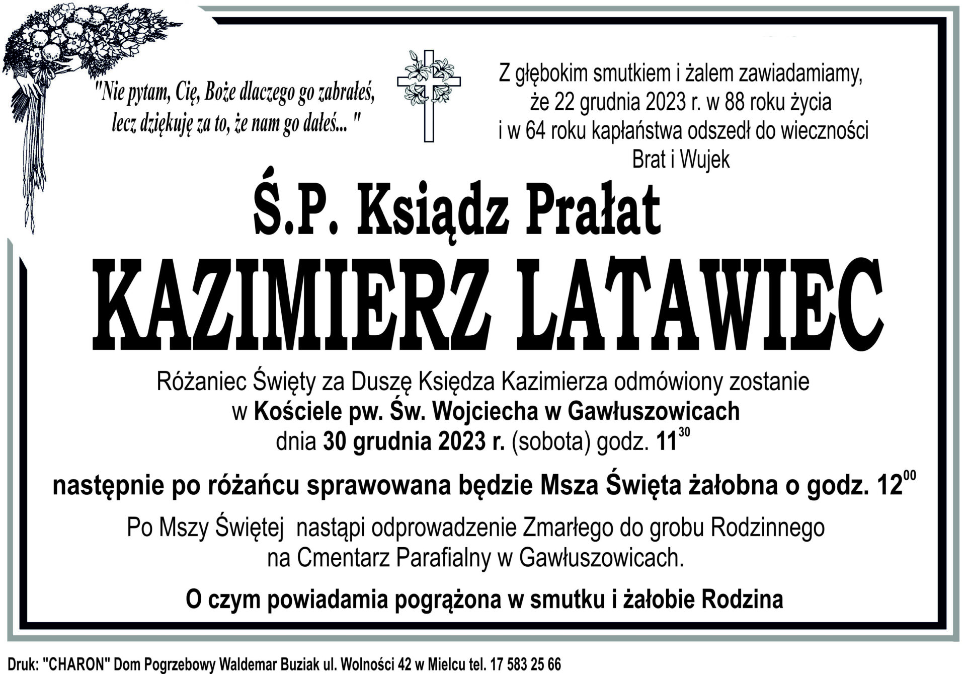 Na wieczną wartę odszedł ks. prał. płk Kazimierz Latawiec z Gawłuszowic, był wieloletnim duszpasterzem Polonii w Republice Federalnej Niemiec, naczelnym kapelanem Polskich Oddziałów Wartowniczych i Technicznych Armii Stanów Zjednoczonych Ameryki oraz proboszczem Polskiej Misji Katolickiej w Mannheim.