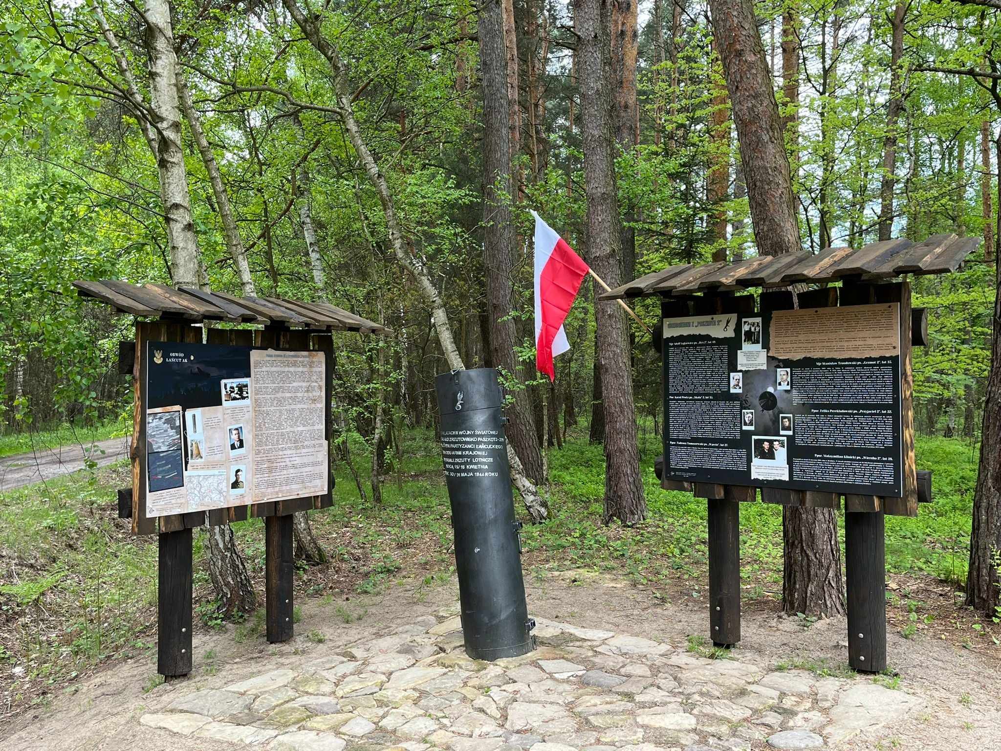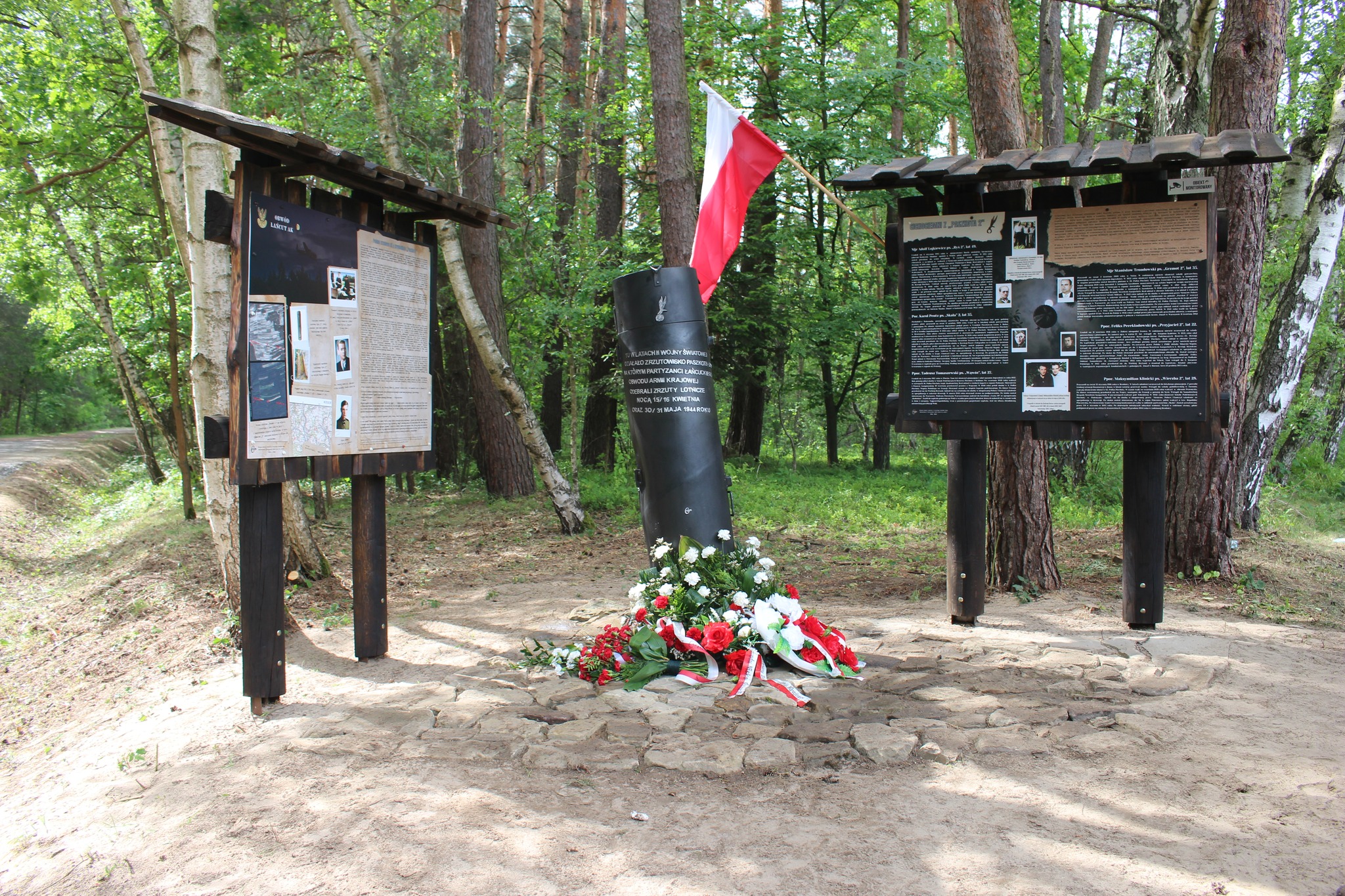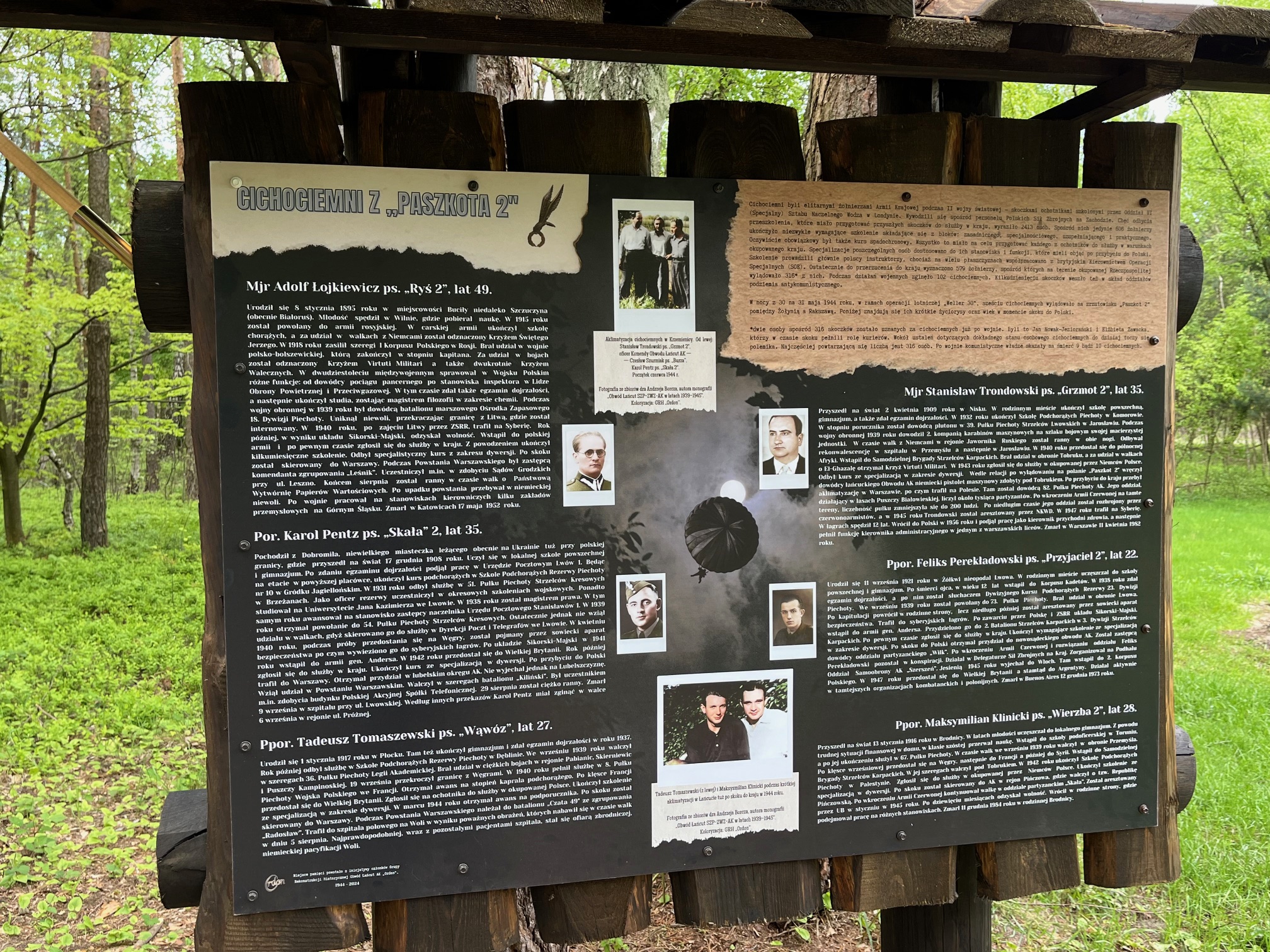 Druga tablica zawiera fotografie oraz krótkie biogramy skaczących na polanę „Paszkot 2” żołnierzy AK wykonujących specjalne zadania w kraju, czyli wspomnianych cichociemnych. Co ciekawe czterech cichociemnych przez krótki czas odbywało aklimatyzację do warunków konspiracyjnych w naszym regionie, zanim udali się do wyznaczonych im zadań bojowych na terenie okupowanego kraju. Realizujące zrzut samoloty „Halifax” z polskimi załogami należącymi do 1586 Eskadry Specjalnego Przeznaczenia nadlatywały z bazy Campo Casale niedaleko Brindisi, położonej w oswobodzonej już przez aliantów części Włoch. Zrzuty na placówkę odbiorczą AK odbywały się około północy. W odbiorze zrzutów uczestniczyły wyspecjalizowane, lokalne oddziały podziemia wojskowego (Obwód Łańcut AK). Część żołnierzy odpowiadała za sygnalizację świetlną z lotnikami, zadaniem innych było zebranie i transport otrzymanych pojemników i przejęcie skoczków, a pozostali ubezpieczali placówkę odbiorczą. Obecnie polanę częściowo porasta las, jednakże w kwietniu i maju 1944 roku miejsce to było otwarte i idealnie nadawało się do bezpiecznego przejęcia skaczących cichociemnych oraz odebrania zrzucanych na spadochronach, nieco rozproszonych w terenie zasobników i paczek z materiałami wojskowymi