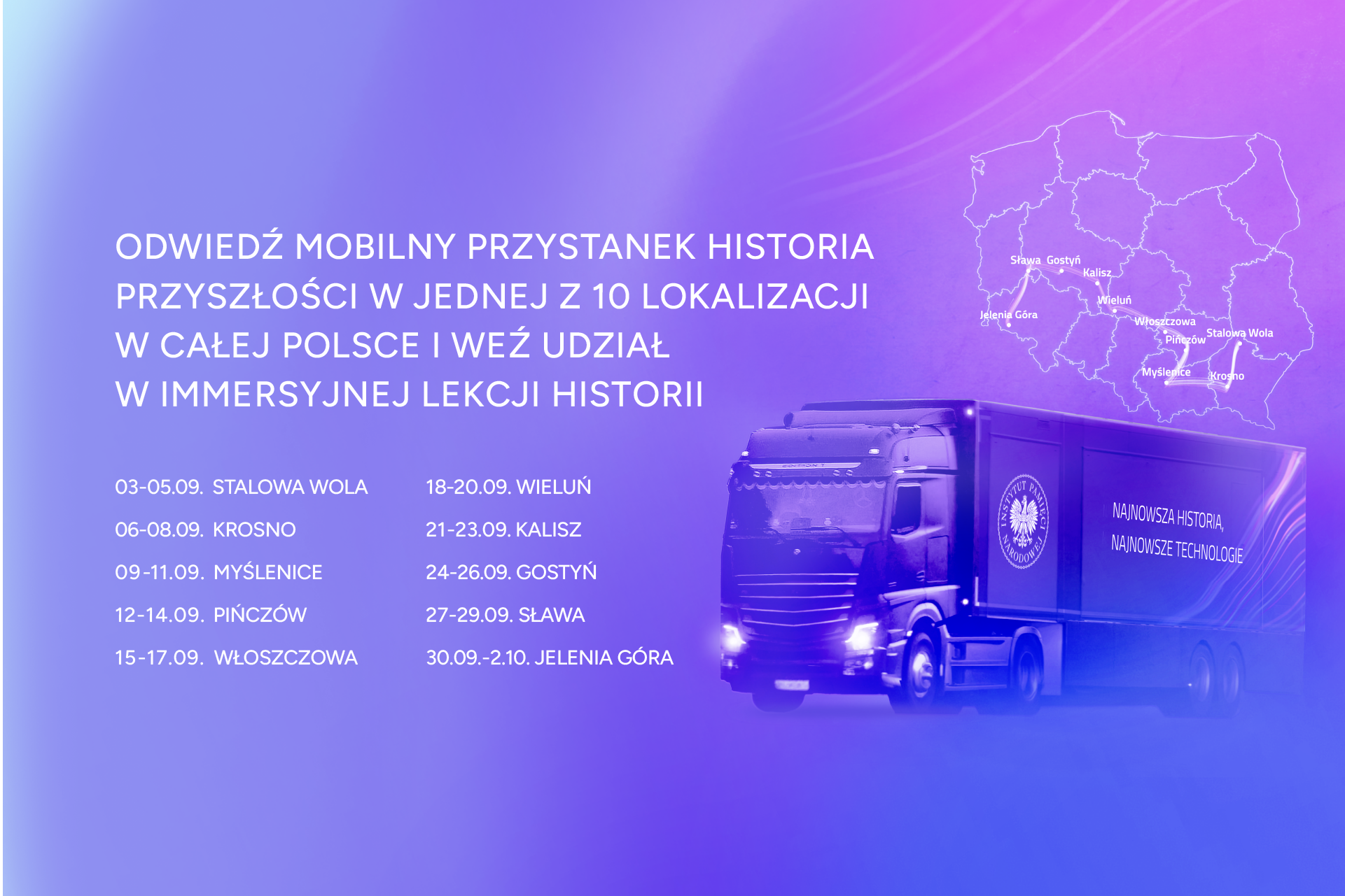 3 września o godz. 10.00 startuje Mobilny Przystanek Historia Przyszłości, czyli inicjatywa, która zachęca do wzięcia udziału w nowoczesnej edukacji historycznej w nowy, atrakcyjny i immersyjny sposób. Za pomocą specjalnie wyposażonego pojazdu (TIR), zostaną zaprezentowane główne projekty Biura Nowych Technologii IPN.