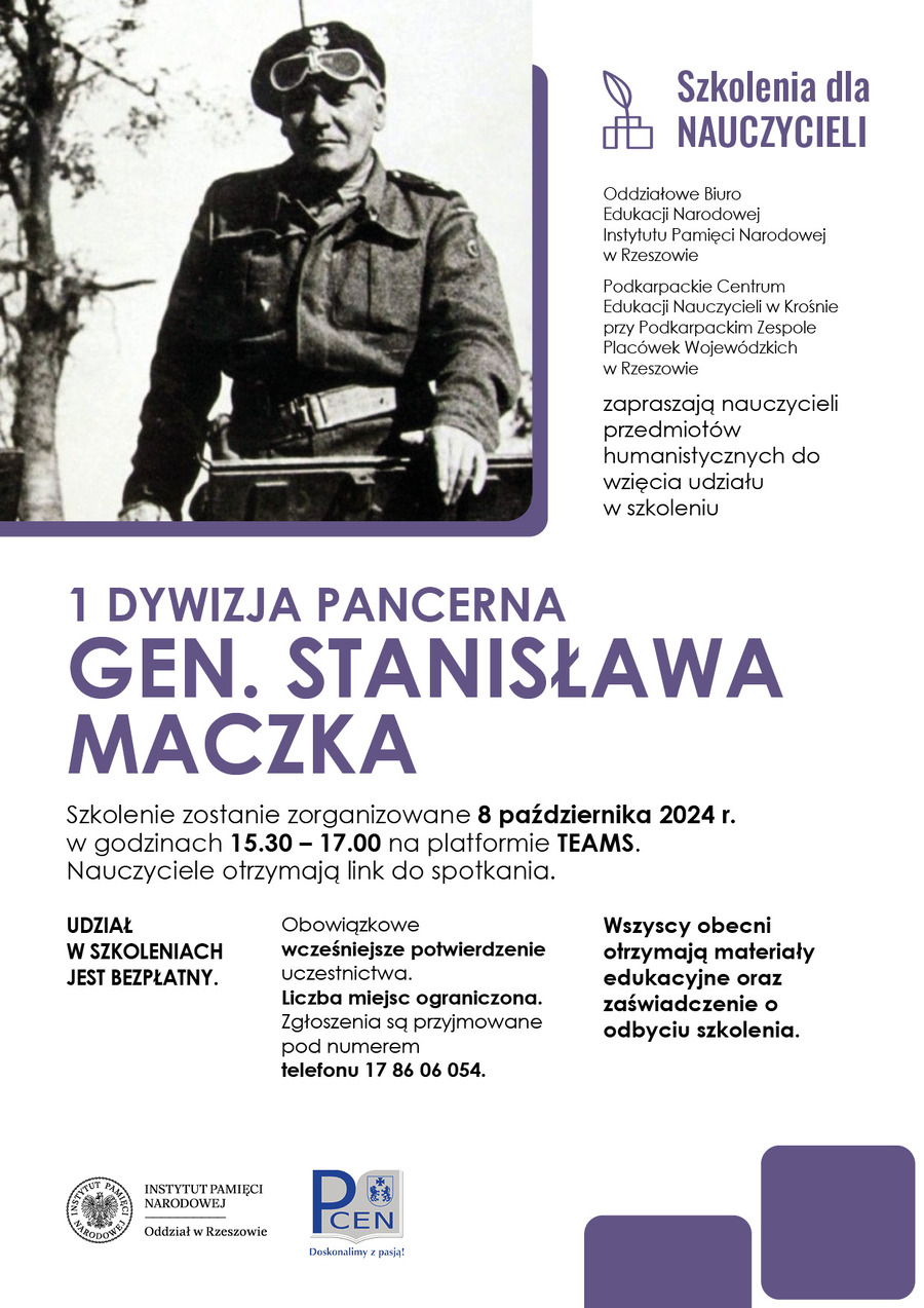 Oddziałowe Biuro Edukacji Narodowej IPN w Rzeszowie wraz z Podkarpackim Centrum Edukacji Nauczycieli w Krośnie przy Podkarpackim Zespole Placówek Wojewódzkich w Rzeszowie zapraszają nauczycieli przedmiotów humanistycznych do wzięcia udziału w szkoleniu „ 1 Dywizja Pancerna gen. Stanisława Maczka”.