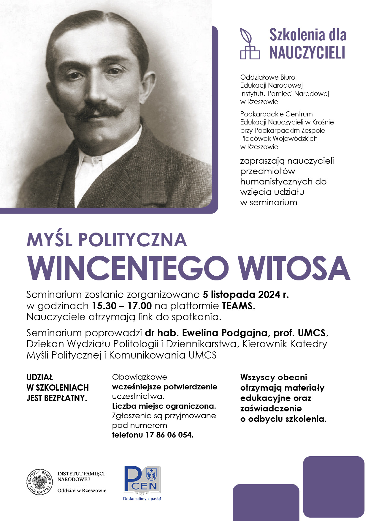 Oddziałowe Biuro Edukacji Narodowej IPN w Rzeszowie i Podkarpackie Edukacji Centrum Nauczycieli w Krośnie przy Podkarpackim Zespole Placówek Wojewódzkich w Rzeszowie zapraszają nauczycieli przedmiotów humanistycznych do wzięcia udziału w seminarium „Myśl polityczna Wincentego Witosa”.