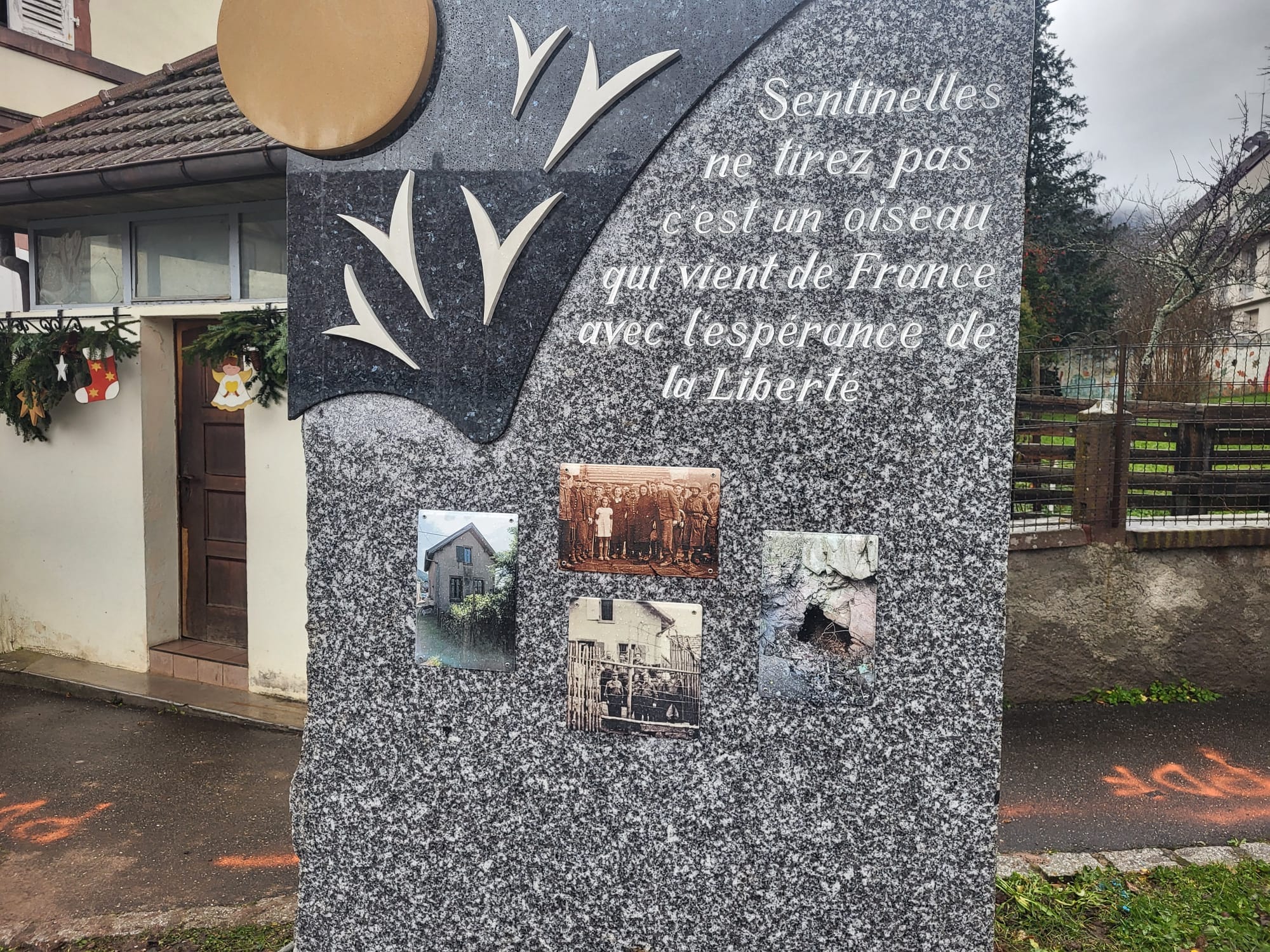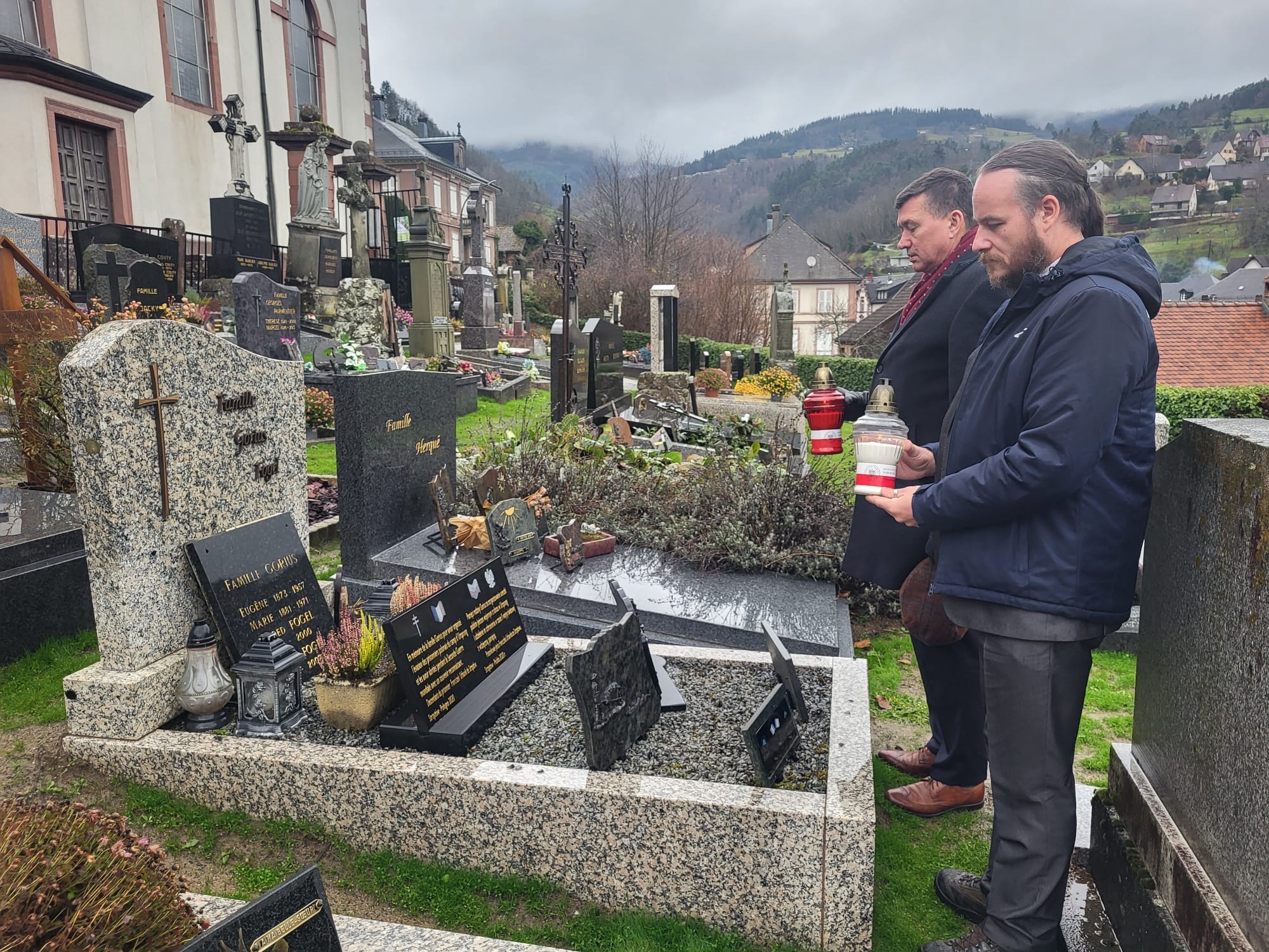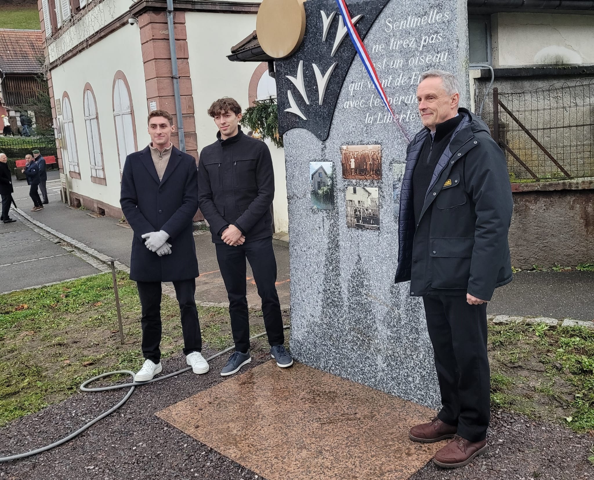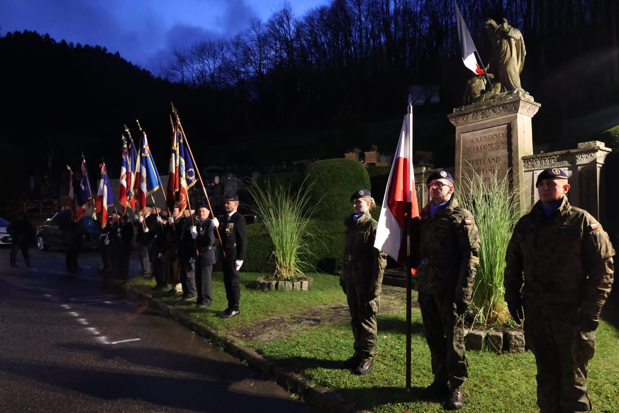 Po Mszy św. zgromadzeni goście przenieśli się na plac przykościelny, gdzie umiejscowiono pomnik upamiętniający mieszkańców społeczności Fréland – poległych podczas dwóch wojen. Ofiary zostały upamiętnione przez złożenie wiązanki kwiatów przez biorące udział w uroczystości delegacje.