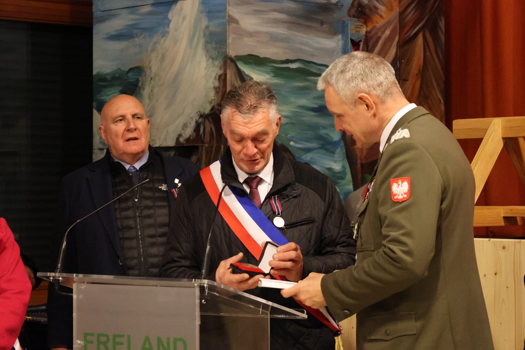 Następna część uroczystości miała miejsce pod tablicą upamiętniającą mieszkańców Fréland, którzy udzieli schronienia jeńcom. Gen. broni Piotr Błazeusz razem z płk. rezerwy Mariuszem Cichowiczem reprezentującym Urząd ds. Kombatantów i Osób Represjonowanych, odznaczyli medalem „Pro Patria”: honorowego burmistrza i byłego radnego generalnego – Cloude Didierjean, Burmistrza Freland – Jean Louis Barlier, Stowarzyszenie Kombatantów we Fréland, Stowarzyszenie UNC z Pays Welche - Cloude Schmitt.