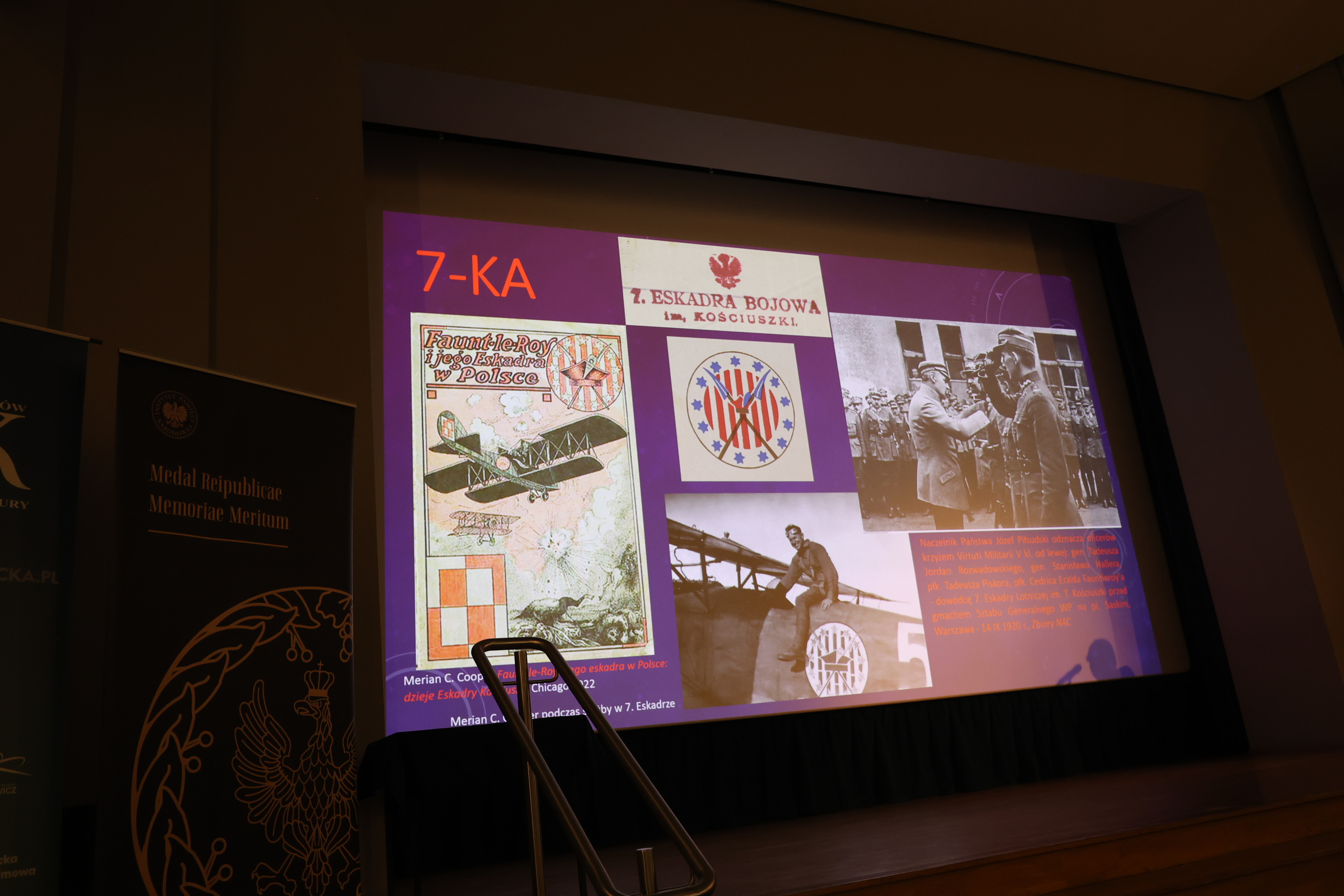 Po uroczystości wręczenia Medali odbyła się prelekcja dr. Jacka Magdonia „7. Eskadra Myśliwska”  wprowadzająca w tematykę filmu „Trzy śmierci Meriana Coopera“. Merian Caldwell Cooper był wybitnym filmowcem, reżyserem i scenarzystą, producentem 62 filmów, laureatem Oscara w 1952 r. za twórczy wkład w sztukę filmową. Był także podpułkownikiem pilotem Wojska Polskiego w latach 1919-1920, a podczas wojny polsko-bolszewickiej walczył w 7. Eskadrze Myśliwskiej im. Tadeusza Kościuszki. W latach 1919-1921, gdy trwała wojna z sowiecką Rosją, dużą rolę w tym konflikcie odgrywało lotnictwo wojskowe, wojsko polskie w walkach z powietrza wspierali lotnicy amerykańscy z 7. Eskadry Myśliwskiej im. Tadeusza Kościuszki. Jednym z nich był Merian Cooper. Największym osiągnięciem eskadry był udział w zwycięskiej bitwie o Lwów w sierpniu 1920 roku. Podczas II wojny światowej, jako szef sztabu dowódcy Amerykańskich Sił Powietrznych w Chinach, gen. C. Chennaulta, a następnie zastępca szefa sztabu lotnictwa amerykańskiego na Pacyfiku, gen. MacArthura, dosłużył się stopnia generała brygady.
