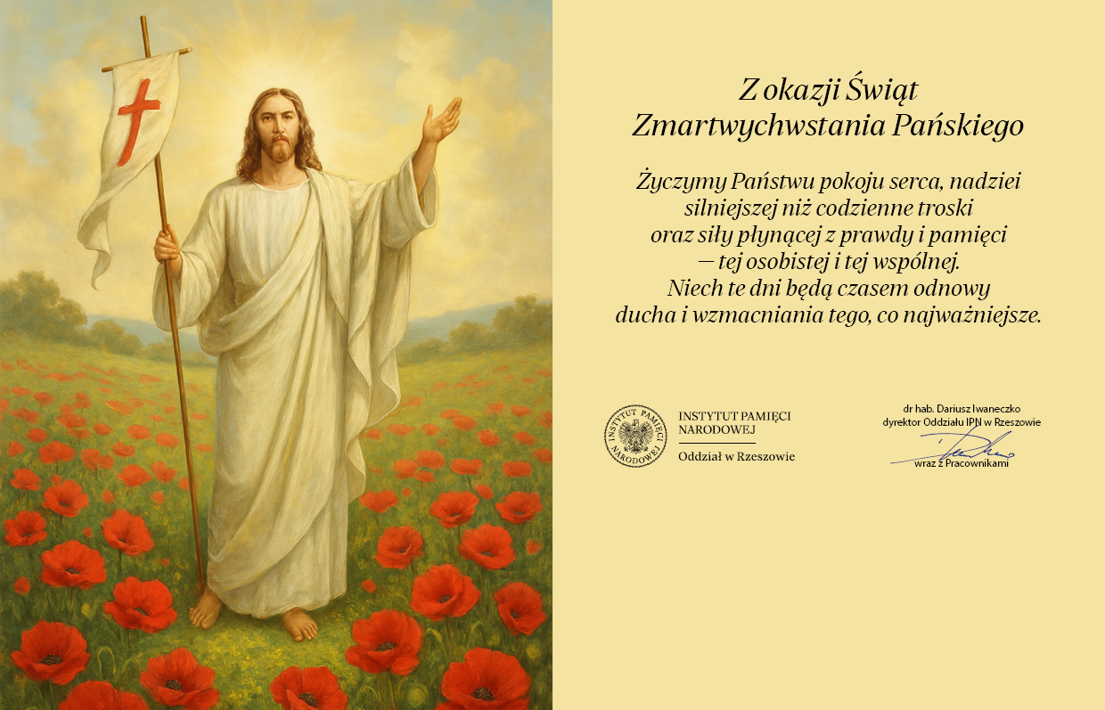 Z okazji Świąt Zmartwychwstania Pańskiego życzymy Państwu pokoju serca, nadziei silniejszej niż codzienne troski oraz siły płynącej z prawdy i pamięci – tej osobistej i tej wspólnej. Niech te dni będą czasem odnowy ducha i wzmacniania tego co najważniejsze życzy dr hab. Dariusz Iwaneczko, dyrektor Instytutu Pamięci Narodowej Oddział w Rzeszowie wraz z Pracownikami.