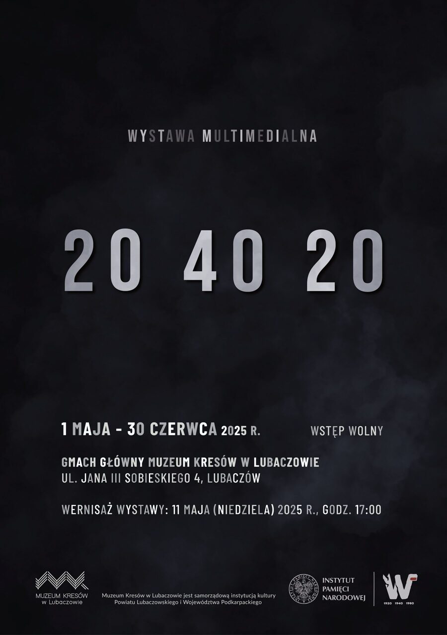 Muzeum Kresów w Lubaczowie oraz Instytut Pamięci Narodowej zapraszają do obejrzenia wystawy multimedialnej „20 – 40 –20”, w gmachu głównym Muzeum przy ul. Jana III Sobieskiego 4 w Lubaczowie, która jest dostępna dla zwiedzających od 1 maja do 30 czerwca br. Wstęp na wystawę, przez cały okres jej trwania, jest wolny.