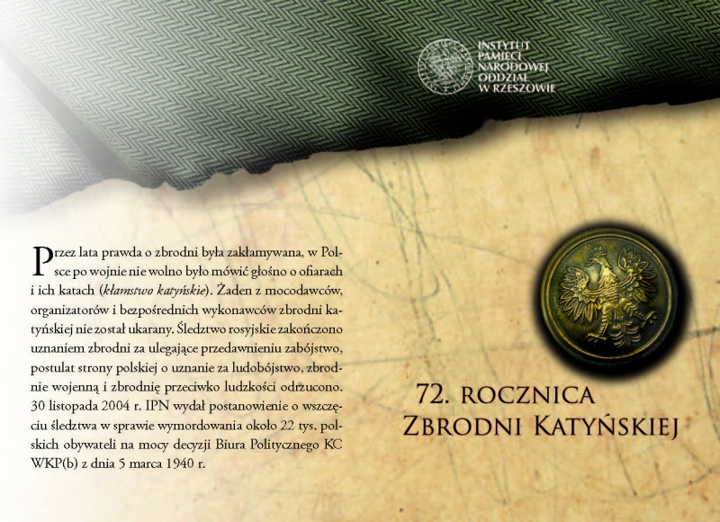 W ramach obchodów 72. rocznicy zbrodni katyńskiej 13 kwietnia br. na terenie Rzeszowa prowadzona będzie akcja edukacyjna polegająca na rozpowszechnianiu ulotek przez harcerzy. Ulotki przygotowane zostały przez pracowników Instytutu Pamięci Narodowej Oddział w Rzeszowie. Zawierają informację o zbrodni katyńskiej oraz kłamstwie katyńskim.