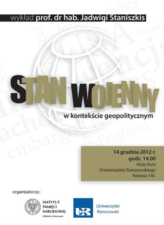 14 grudnia 2012 r.odbył się wykład prof. dr hab. Jadwigi Staniszkis pt. „Stan wojenny w kontekście geopolitycznym”. Wykład miał miejsce w Małej Auli Uniwersytetu Rzeszowskiego – ul. Rejtana 16 c).