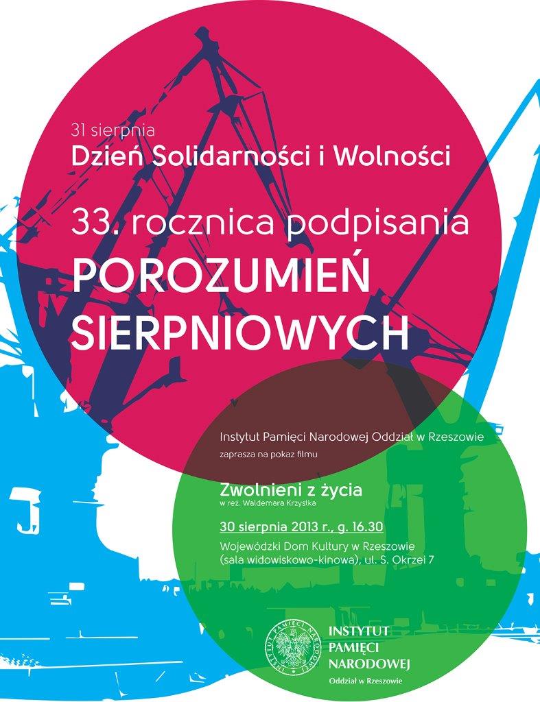 Instytut Pamięci Narodowej Oddział w Rzeszowie zaprasza na pokaz filmu „Zwolnieni z życia” w reż. Waldemara Krzystka w ramach cyklu „Kadr z historii…”. Projekcja odbędzie się 30 sierpnia 2013 r. w Wojewódzkim Domu Kultury w Rzeszowie (sala widowiskowo-kinowa, ul. S. Okrzei 7) w związku z  33. rocznicą podpisania Porozumień Sierpniowych. Pokaz poprzedzony zostanie prelekcją historyka – dr. Marcina Bukały (OBEP IPN Rzeszów). Rozpoczęcie – godz. 16.30.