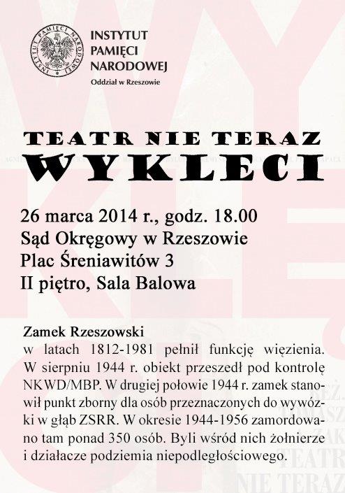 Instytut Pamięci Narodowej Oddział w Rzeszowie zaprasza na spektakl teatralny „Wyklęci" w reżyserii Tomasza A. Żaka, przygotowany przez Teatr Nie Teraz z Tarnowa. Spektakl zaprezentowany zostanie w Rzeszowie 26 marca 2014 r., o godz. 18.00, w Sądzie Okręgowym (Rzeszów, plac Śreniawitów 3, II piętro, Sala Balowa).