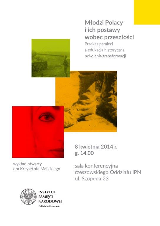 8 kwietnia 2014 r. w budynku rzeszowskiego oddziału IPN (ul. Szopena 23) odbędzie się wykład otwarty dr. Krzysztofa Malickiego „Młodzi Polacy i ich postawy wobec przeszłości. Przekaz pamięci a edukacja historyczna pokolenia transformacji". Rozpoczęcie wykładu – godz. 14.00.