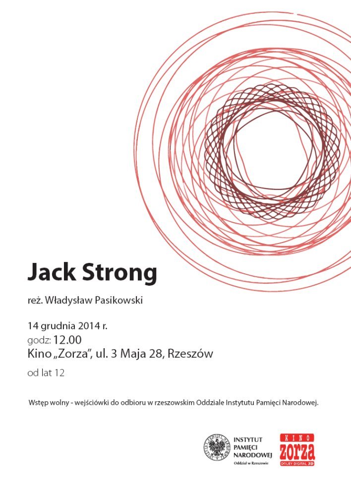 Instytut Pamięci Narodowej Oddział w Rzeszowie zaprasza na pokaz filmu „Jack Strong" w reżyserii Władysława Pasikowskiego. Film poprzedzony zostanie prelekcją historyka. Pokaz odbędzie się 14 grudnia 2014 r. w kinie „Zorza" w Rzeszowie (ul. 3 Maja 28), o godzinie 12.00. Organizatorem pokazu jest Instytut Pamięci Narodowej Oddział w Rzeszowie.