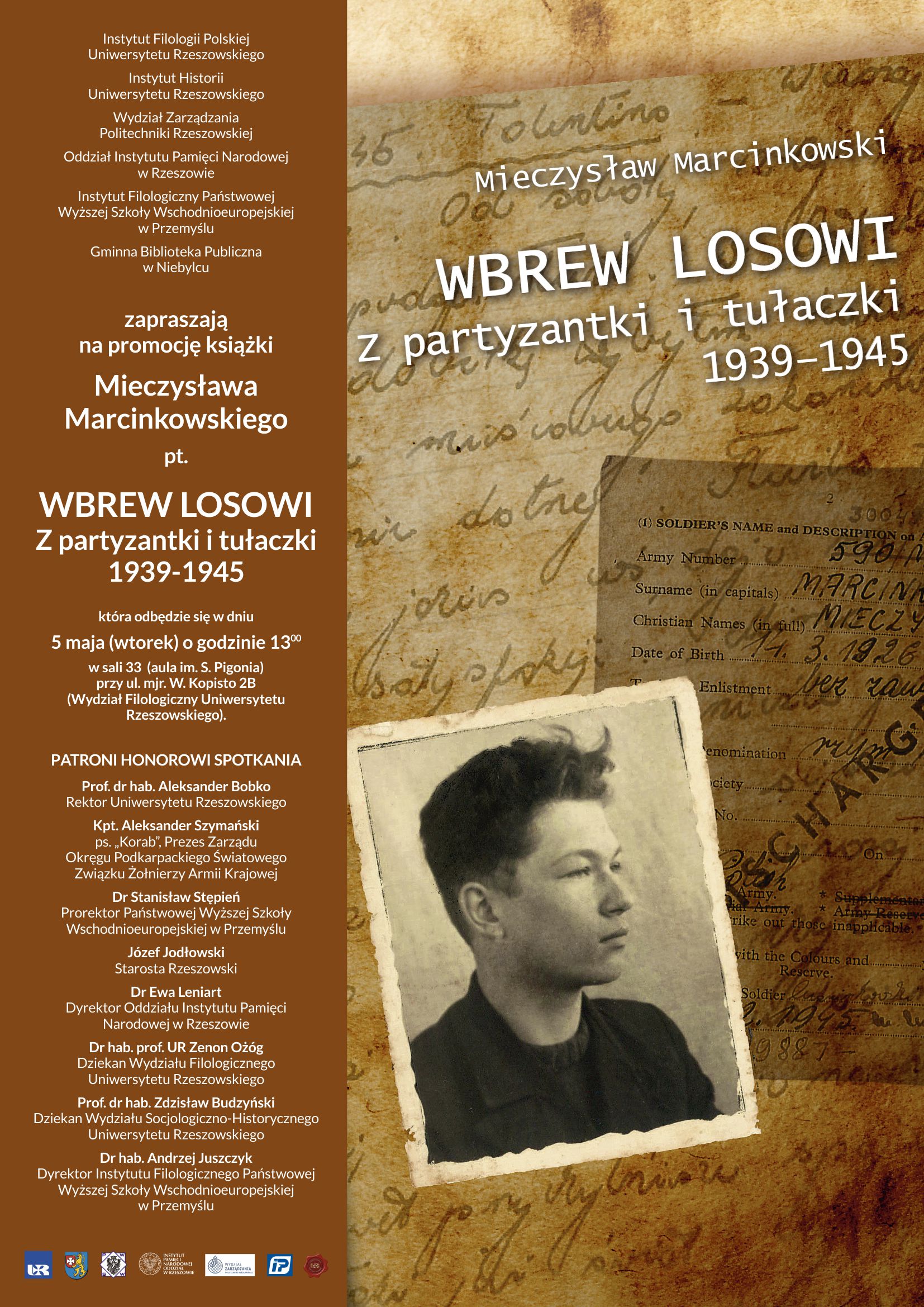 Instytut Filologii Polskiej Uniwersytetu Rzeszowskiego, Instytut Historii Uniwersytetu Rzeszowskiego, Wydział Zarządzania Politechniki Rzeszowskiej, Instytut Pamięci Narodowej Oddział w Rzeszowie, Instytut Filologiczny Państwowej Wyższej Szkoły Wschodnioeuropejskiej w Przemyślu i Gminna Biblioteka Publiczna w Niebylcu zapraszają na promocję książki Mieczysława Marcinkowskiego „Wbrew losowi. Z partyzantki i tułaczki 1939–1945”, która odbędzie się 5 maja 2015 r. w Rzeszowie (Wydział Filologiczny Uniwersytetu Rzeszowskiego, sala nr 33, aula im. S. Pigonia). Rozpoczęcie spotkania – godz. 13.00.