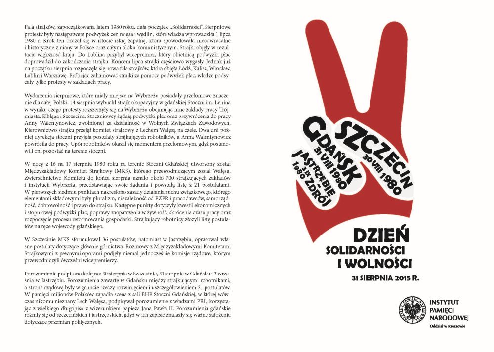 31 sierpnia 2015 r. w prasie lokalnej („Super Nowości”) na terenie województwa podkarpackiego zamieszczona zostanie ulotka informacyjna „Dzień Solidarności i Wolności”.