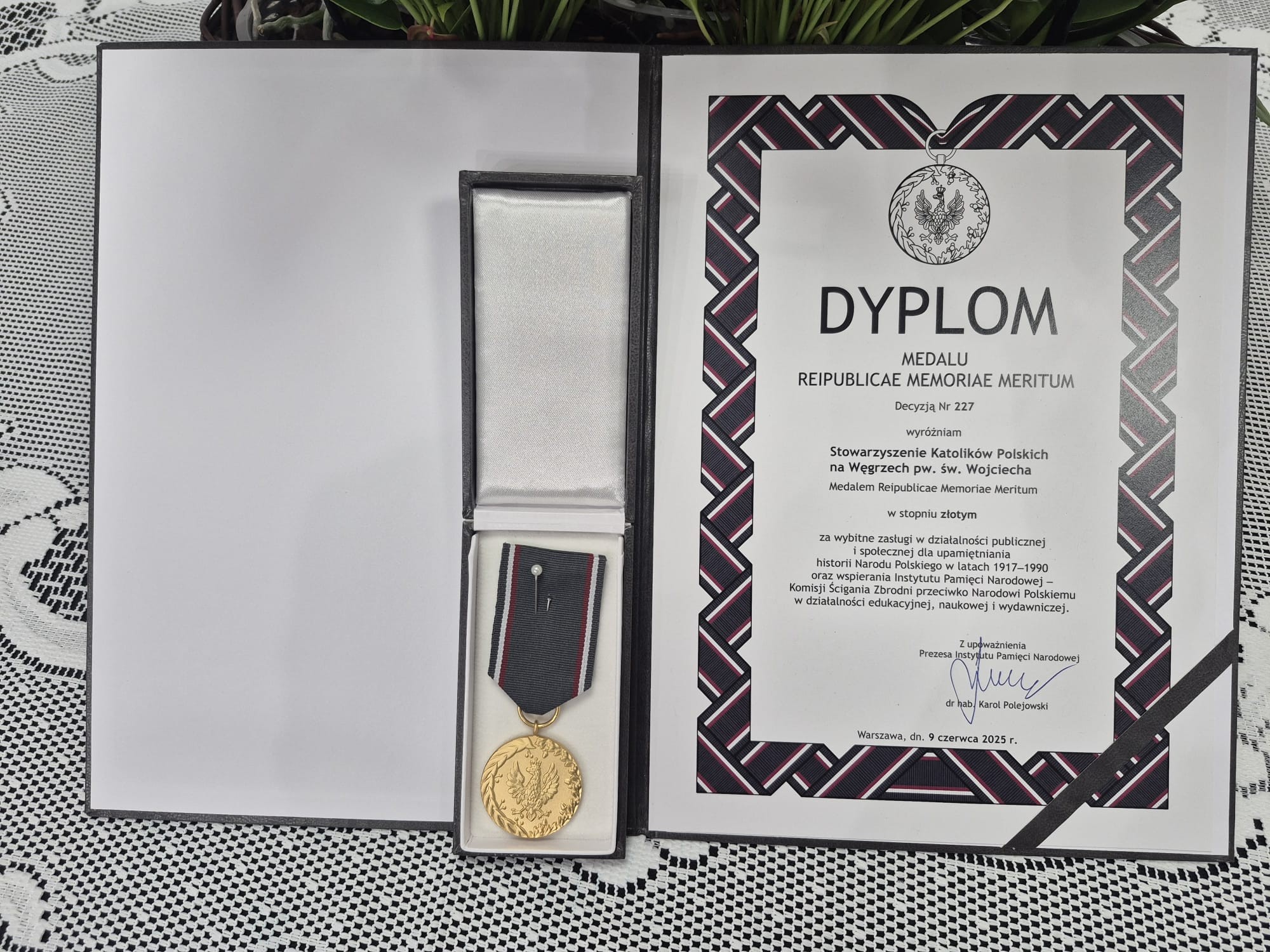 Za nadzwyczaj staranną i pełną zaangażowania wieloletnią działalność i wybitne zasługi w działalności publicznej i społecznej dla upamiętnienia historii Narodu Polskiego w l. 1919-1990 oraz wspieranie Instytutu Pamięci Narodowej w działalności edukacyjnej, naukowej i wydawniczej, Stowarzyszenie Katolików Polskich na Węgrzech pw. św. Wojciecha, Instytut Pamięci Narodowej na wniosek Oddziału w Rzeszowie uhonorował złotym medalem medalu „Reipublicae Memoriae Meritum”, który z rąk dr. hab. Dariusza Iwaneczko odebrał zarząd SKPnaW pw. św.Wojciecha.