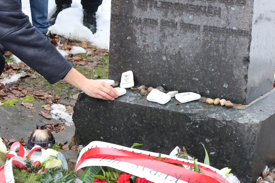 Pod obeliskiem upamiętniającym tych, którzy zginęli w czasie zagłady, zapalone zostały znicze, złożone wieńce i wiązanki kwiatów oraz kamyki, symbolizujące w tradycji żydowskiej pamięć o zmarłych.
