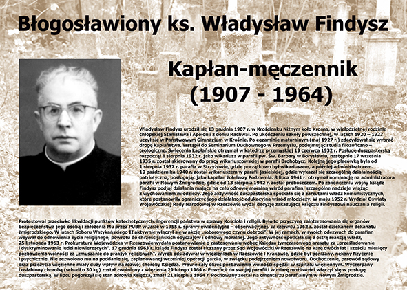 Wystawa ukazuje życie i posługę duszpasterską Sługi Bożego księdza Władysława Findysza, skazanego w grudniu 1963 r. przez Sąd Wojewódzki w Rzeszowie, pomimo śmiertelnej choroby, na 2 lata i 6 miesięcy więzienia. Ksiądz Władysław Findysz jest pierwszym męczennikiem systemu komunistycznego w Polsce, wobec którego stwierdzono, iż poniósł śmierć z powodu cierpień zadanych mu w więzieniu in odium fidei, tzn. z motywu nienawiści do wiary, a także potwierdzono fakt jego męczeństwa. Ksiądz Władysław Findysz został beatyfikowany 19 czerwca 2005 r.