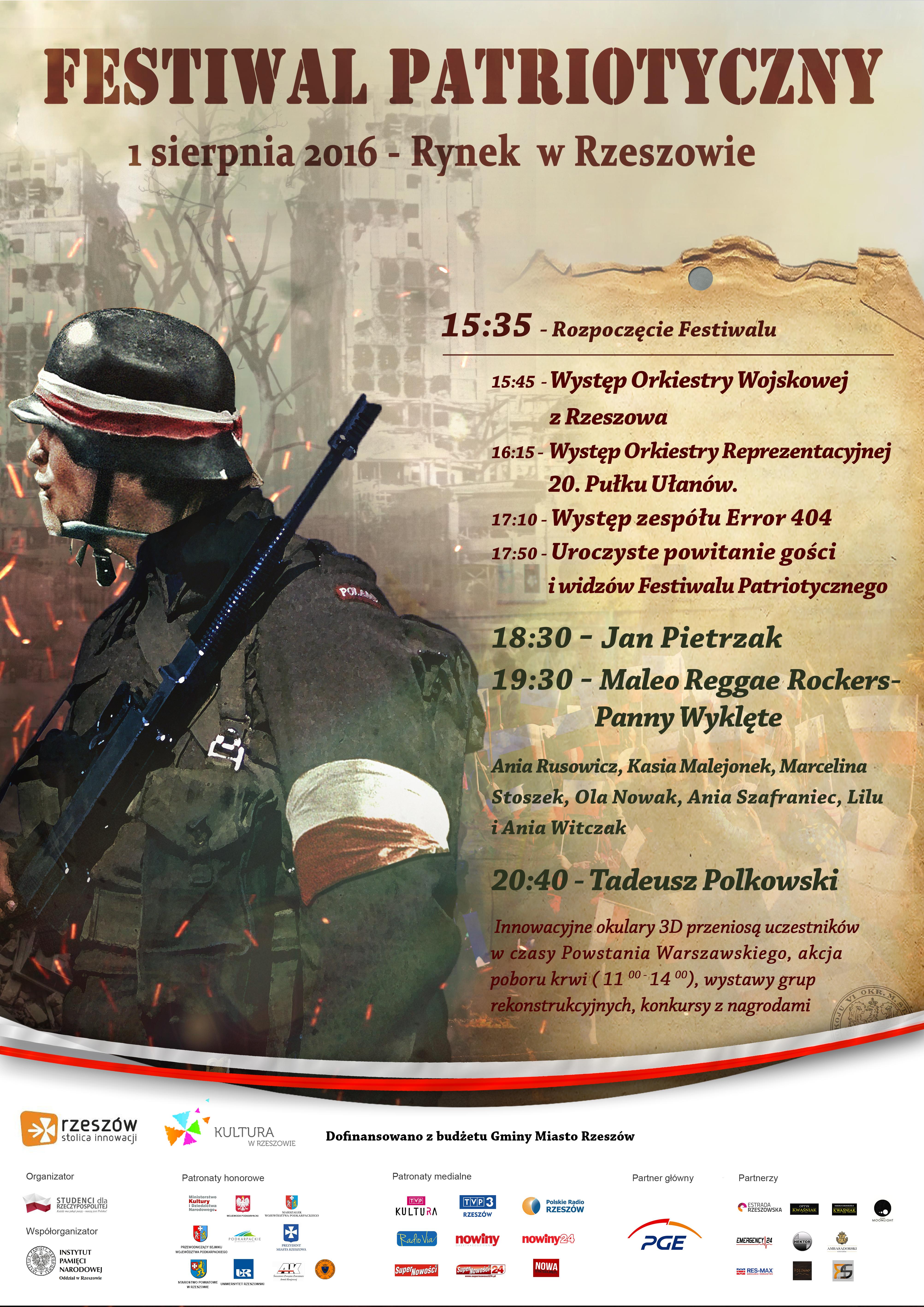 1 sierpnia 2016 r. w godz. 11:00–22:00 na rzeszowskim rynku odbędzie się Festiwal Patriotyczny z okazji 72 rocznicy Powstania Warszawskiego.