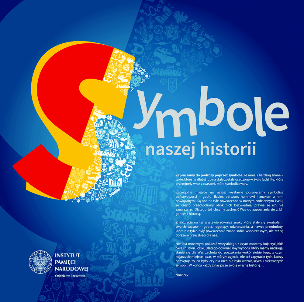 Zapraszamy do podróży poprzez symbole - te mniej i bardziej znane – takie, które na dłużej lub na stałe zostały osadzone w życiu ludzi i te, które przeminęły wraz z czasami, które symbolizowały. Szczególne miejsce na naszej wystawie poświęcamy symbolice państwowości – godłu, fladze, barwom, hymnowi i znakom z nimi powiązanymi. Są one na tyle powszechne w naszym codziennym życiu, ze często przechodzimy obok nich bezwiednie, prawie ze ich nie zauważając. Dlatego tez chcemy zachęcić Was do zapoznania się z ich genezą i historią.. Znajdziecie na tej wystawie również znaki, które stały się symbolami swoich czasów – godła, logotypy, odznaczenia, a nawet przedmioty, które nie tylko były powszechnie znane sobie współczesnym, ale tez są obrazem przeszłości dla nas. Nie jest możliwym pokazać wszystkiego z czym możemy kojarzyć jakiś okres historii Polski. Dlatego dokonaliśmy wyboru, który mamy nadzieje, stanie się dla Was zachęta do poszukania wokół siebie tego, z czym kojarzycie miejsce i czas, w którym żyjecie. Ale też zapytacie tych, którzy pamiętają to, co było, czy dla nich nie było ważniejszych i ciekawszych symboli. W końcu każdy z nas pisze swoja własna historie…