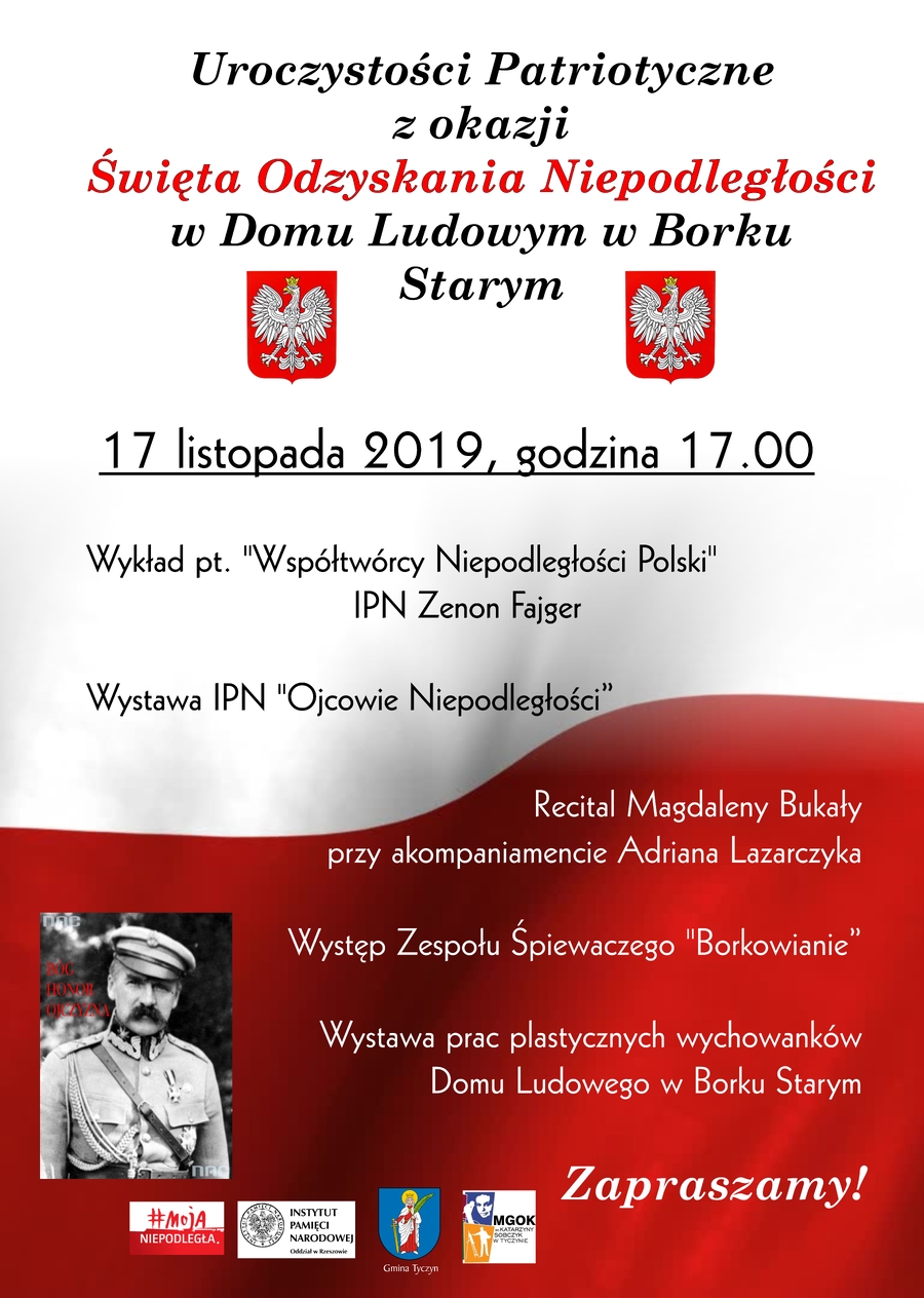 17 listopada 2019 r. o godz. 17.00 w Domu Ludowym w Borku Starym odbędą się uroczystości z okazji Święta Odzyskania Niepodległości.
