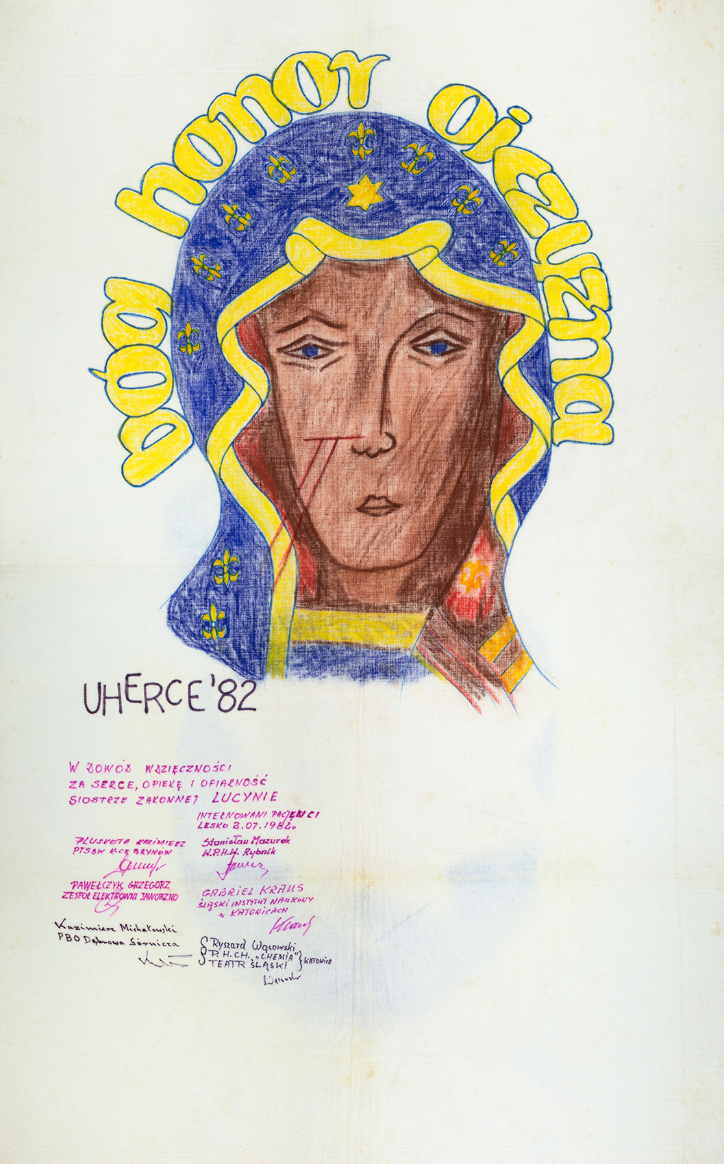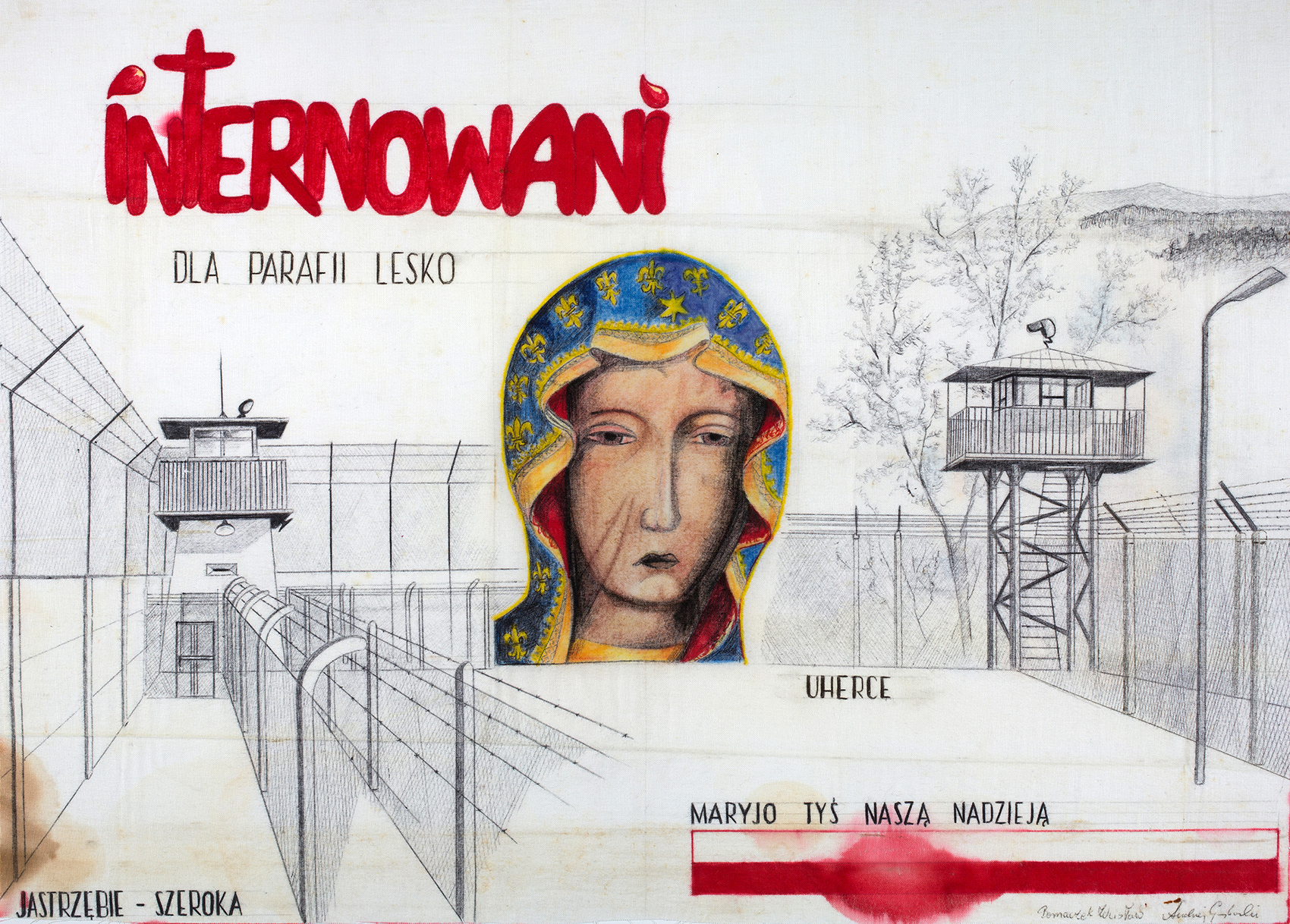 Zdjęcie 001. Materiał bawełniany (o wymiarach 56,5 x 40,5 cm) z narysowanym wizerunkiem Matki Bożej Częstochowskiej, wieżami strażniczymi, ogrodzeniem zakładu karnego w Uhercach oraz napisami wykonanymi w szpitalu w Lesku w maju 1982 r. przez więźniów politycznych internowanych w zakładzie karnym w Uhercach. Ta szczególna pamiątka została wykonana przez internowanych dla parafii Lesko w podziękowaniu za udzieloną im pomoc. Pod rysunkiem są dwa nazwiska internowanych: Zdzisław Bernaczek i Andrzej Grzybowski. Obaj w maju 1982 r. podjęli protest głodowy i w związku z pogorszeniem stanu zdrowia – od 24 maja przebywali w szpitalu w Lesku. Oni, jak również inni internowani przebywający okresowo w szpitalu w Lesku, otrzymywali pomoc od Sióstr Służebniczek Starowiejskich, mających dom zakonny w Lesku przy ul. W. Pola 3. Siostry przyjmowały na nocleg osoby z rodzin internowanych, pomagały również w organizowaniu nielegalnych spotkań internowanych z członkami rodzin w domu zakonnym. Jedną z sióstr zaangażowanych w pomoc internowanym była s. Lucyna Żugaj, która za pośrednictwem pana Romana Stygara (męża siostry s. Lucyny – pani Antoniny Stygar z d. Żugaj) przekazała do OA IPN w Rzeszowie dwa kawałki płótna z wizerunkiem Matki Bożej i podpisami internowanych. Siostra L. Żugaj pracowała w 1982 r. w szpitalu w Lesku na oddziale wewnętrznym i bardzo dobrze ocenia postawę lekarzy: Jerzego Tyborowskiego, ordynatora oddziału wewnętrznego i Jana Mielczarka, którzy starali się zawsze pomagać internowanym. Podobnie dobrze ocenia postawę pielęgniarek i salowych, które zawsze trzymały w tajemnicy nielegalne opuszczanie szpitala przez internowanych. Ze Zbioru Romana Stygara.