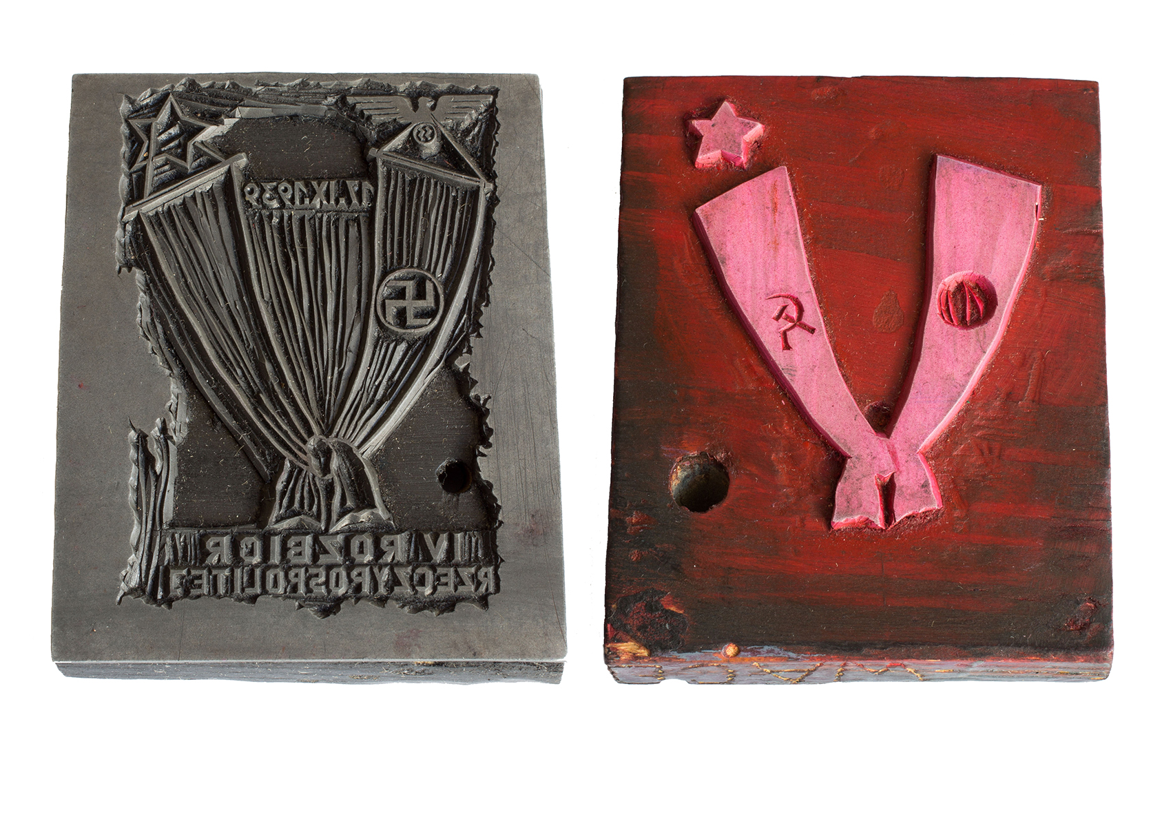 Zdjęcie 004. Dwie matryce wykonane z tworzywa sztucznego (gumoleum) przyklejonego do kawałka drewnianej sklejki. Autor: Grzegorz Połeć. Na jednej matrycy widnieje napis: IV ROZBIÓR RZECZYPOSPOLITEJ 17 IX 1939, poza tym widoczne są: sowiecka gwiazda, hitlerowski orzeł, swastyka. Na drugiej matrycy znajdują się dwie flagi, jedna z sierpem i młotem oraz gwiazda pięcioramienna. Oddziałowe Archiwum IPN w Rzeszowie