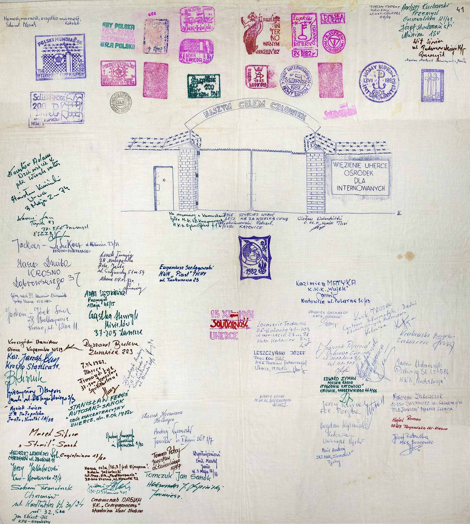 Zdjęcie 032. Materiał płócienny z rysunkami i podpisami osób więzionych w obozie dla internowanych w Hrubieszowie w 1982 r. Ze Zbioru Bogdana Cichego i Krzysztofa Mruka.