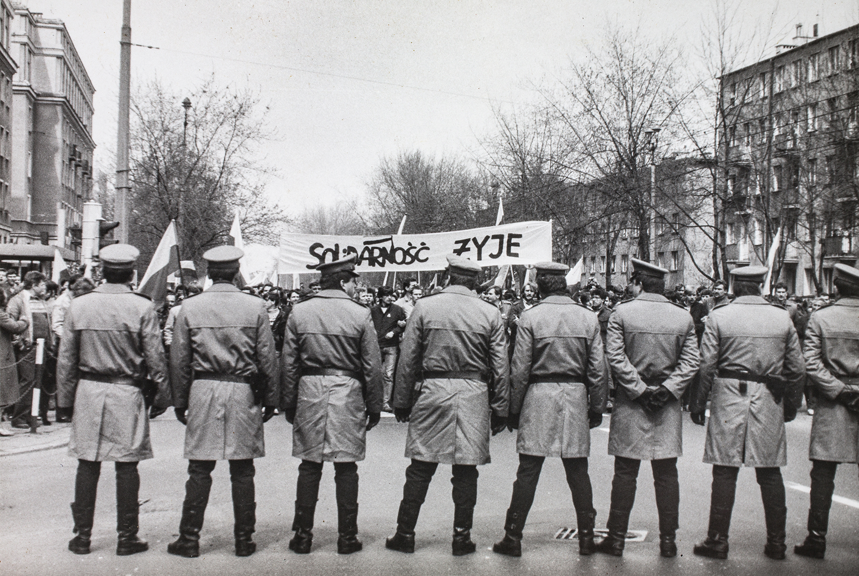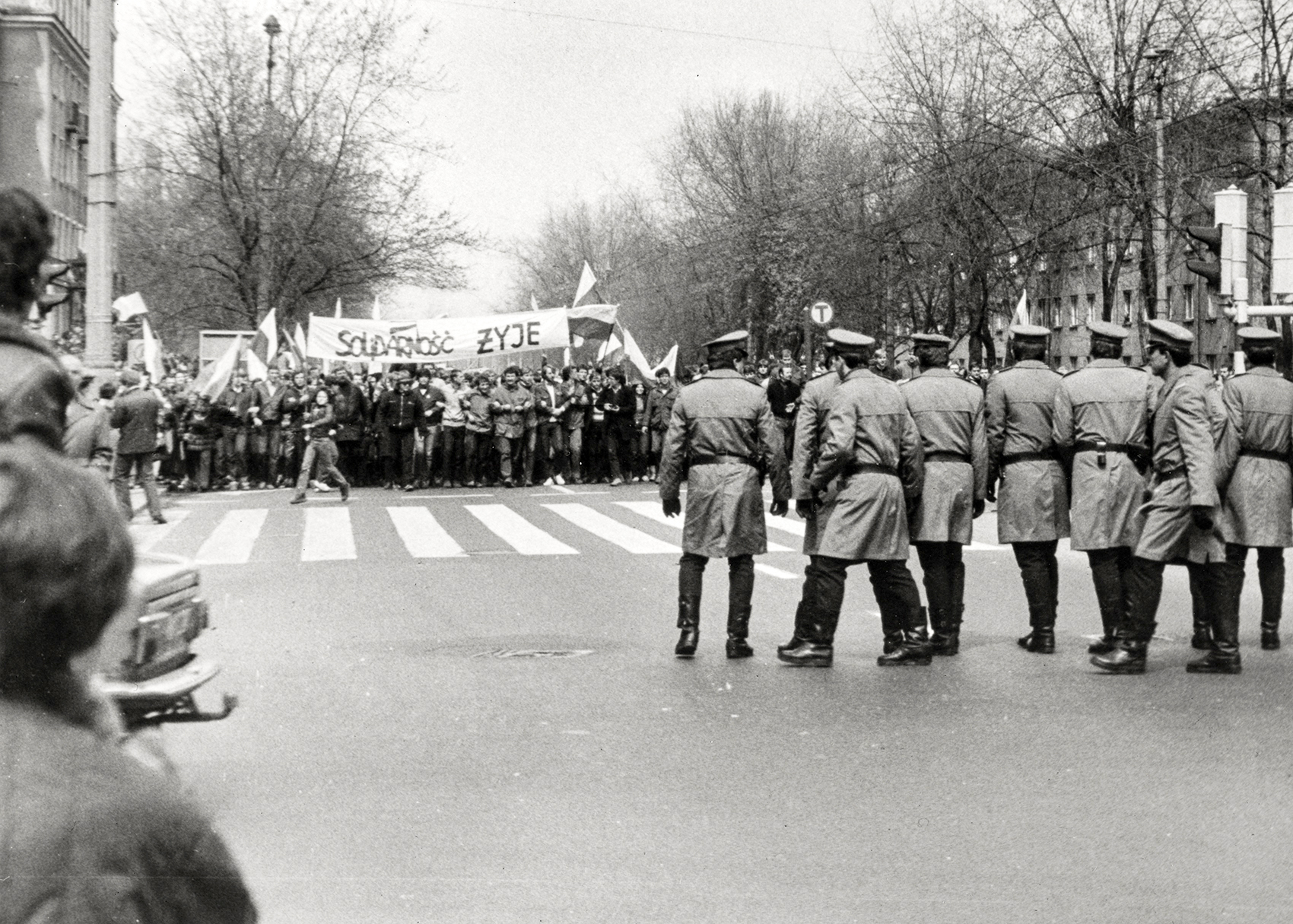 Zdjęcie 016. Sympatycy i działacze NSZZ „Solidarność” stoją na czele pochodu na skrzyżowaniu ul. Stołecznej z ul. Krasińskiego w Warszawie, zablokowani przez milicjantów ustawionych w charakterystycznym kordonie, 1 maja 1985 r.