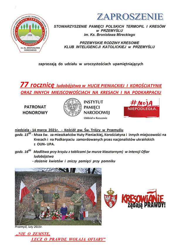 14/03/2021Obchody77. rocznica ludobójstwa w Hucie Pieniackiej i Korościatynie oraz innych miejscowościach na Kresach i na Podkarpaciu – Przemyśl, 14 marca 2021
