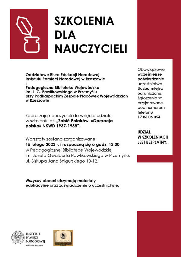 30/01/2023Dla nauczycieliZapraszamy nauczycieli przedmiotów humanistycznych do udziału w szkoleniu pt. „Zabić Polaków. Operacja polska NKWD 1937-38” – Przemyśl, 15 lutego 2023