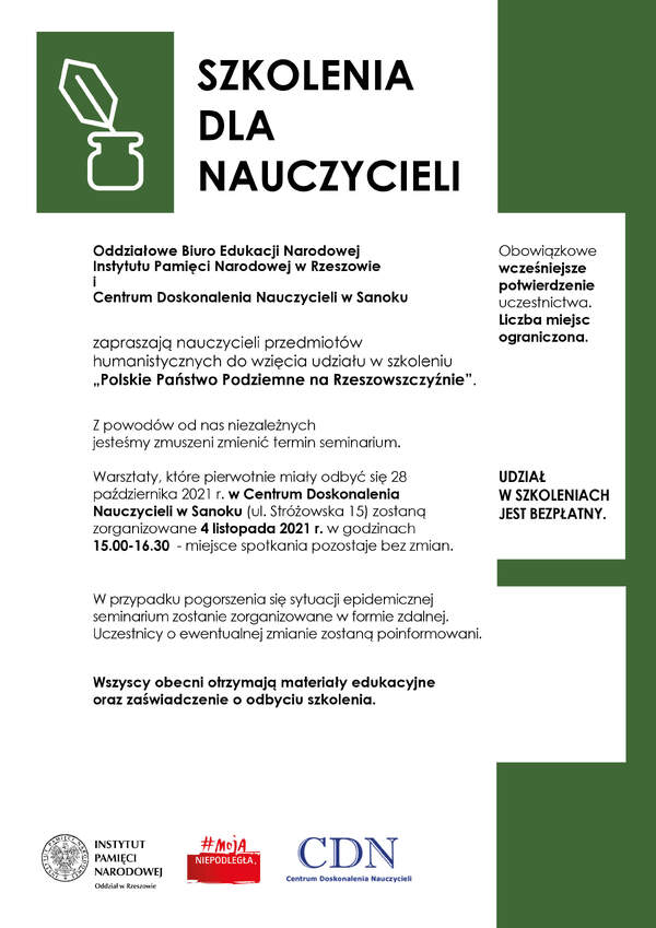 14/10/2021Dla nauczycieliIPN zaprasza nauczycieli na szkolenie „Polskie Państwo Podziemne na Rzeszowszczyźnie” – Sanok, 4 listopada 2021