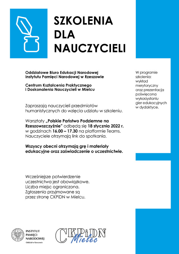 10/01/2022Dla nauczycieliWarsztaty dla nauczycieli w formie online „Polskie Państwo Podziemne na Rzeszowszczyźnie”