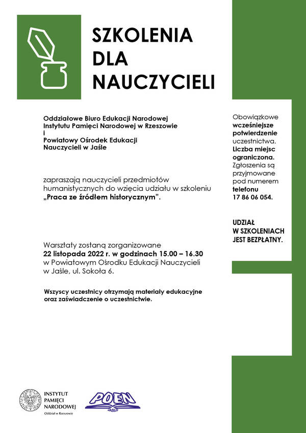 19/10/2021Dla nauczycieliSzkolenie dla nauczycieli „Prace ze źródłem historycznym” – Jasło, 22 listopada 2022
