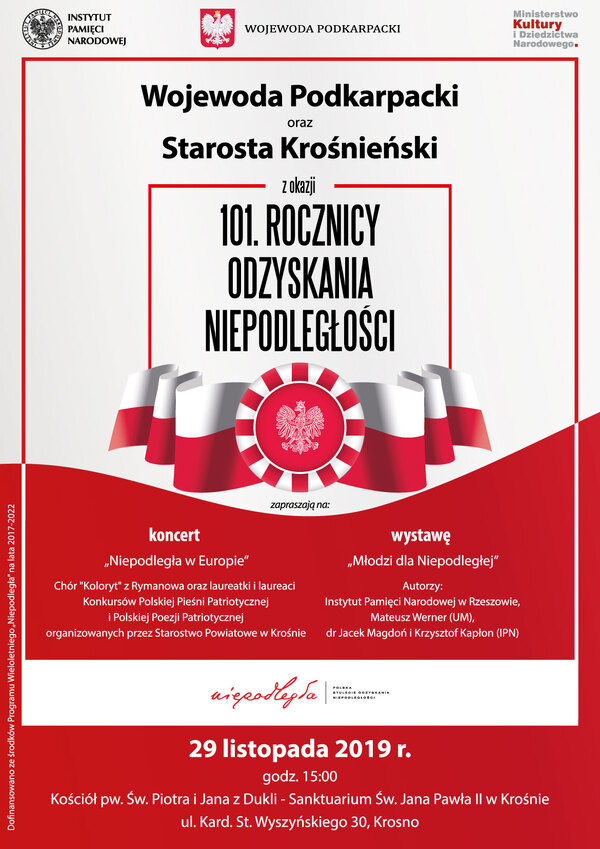 29/11/2019KoncertKoncert i wystawa z okazji 101. rocznicy odzyskania przez Polskę Niepodległości – Krosno, 29 listopada 2019
