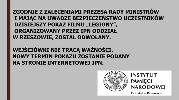 10/03/2020FilmDzisiejszy bezpłatny pokaz filmu „Legiony” w ramach filmowych wtorków z IPN w kinie Zorza w Rzeszowie odwołany!